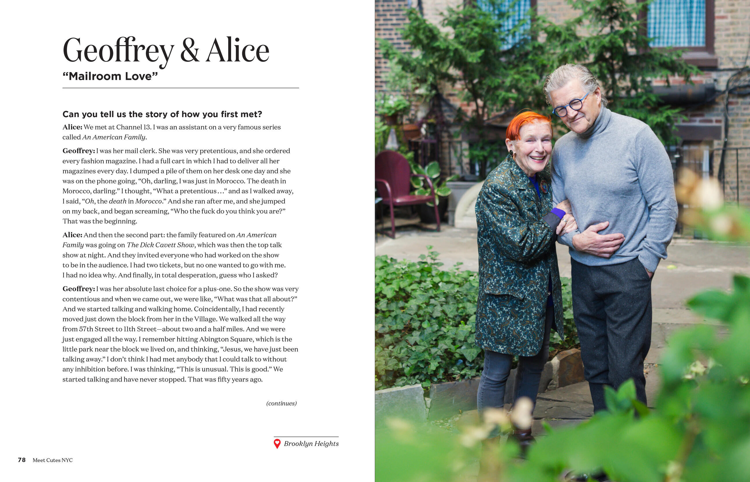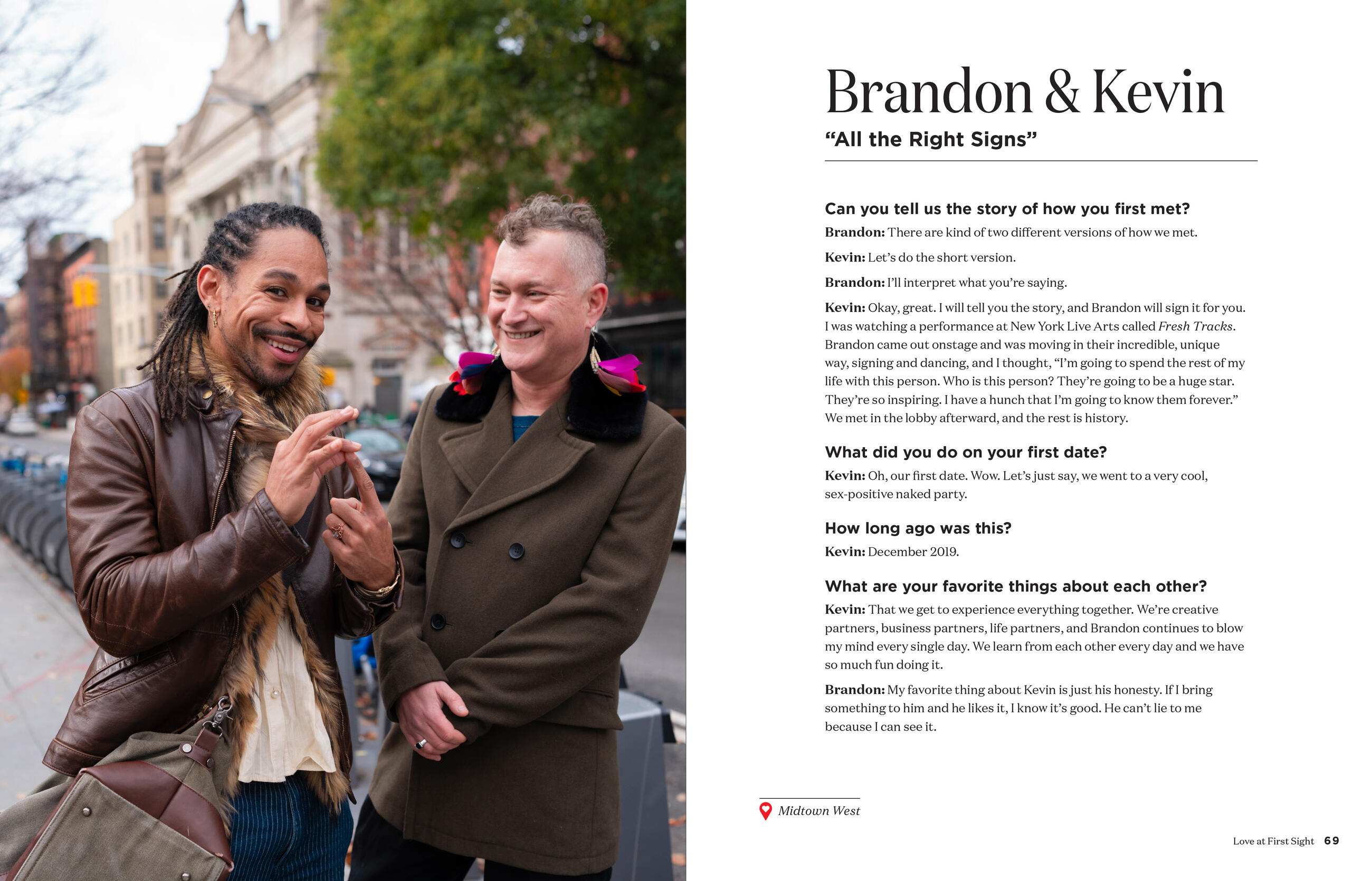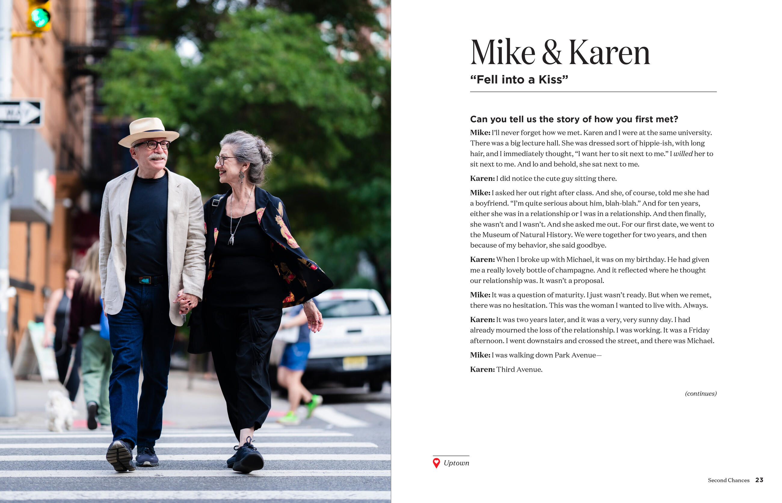 But the stories are each unique—like Chris and Clay, who met while auditioning for West Side Story (they both got it). And Joe and Liza, who met in a hardware store—while Liza was with her boyfriend at the time. There are stories of couples who met on public transportation, at a party, through friends, at work, at church—you truly never know where you might find love. There are also stories of second chances—like Mike and Karen—who met in college, broke up, and then bumped into each other again two years later; they fell into a kiss and have been married for 37 years.