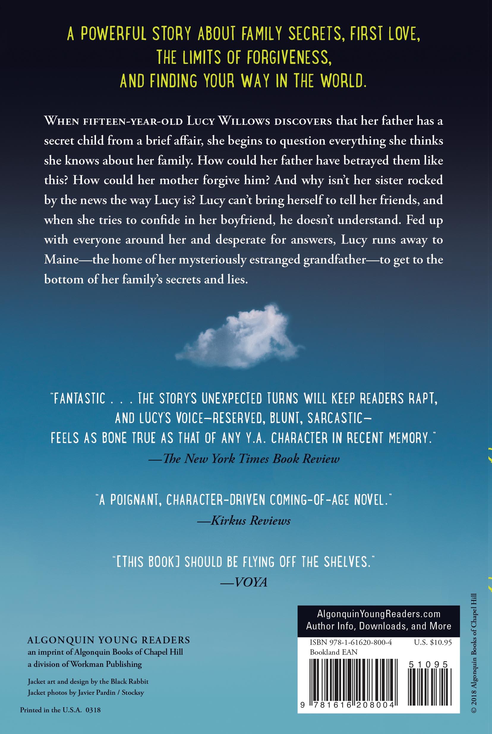 When fifteen-year-old Lucy Willows discovers that her father has a secret child from a brief affair, she begins to question everything she thinks she knows about her family. How could her father have betrayed them like this? How could her mother forgive him? And why isn’t her sister rocked by the news the way Lucy is? Lucy can’t bring herself to tell her friends, and when she tries to confide in her boyfriend, he doesn’t understand. Fed up with everyone around her and desperate for answers, Lucy runs away to Maine—the home of her mysteriously estranged grandfather—to get to the bottom of her family’s secrets and lies.