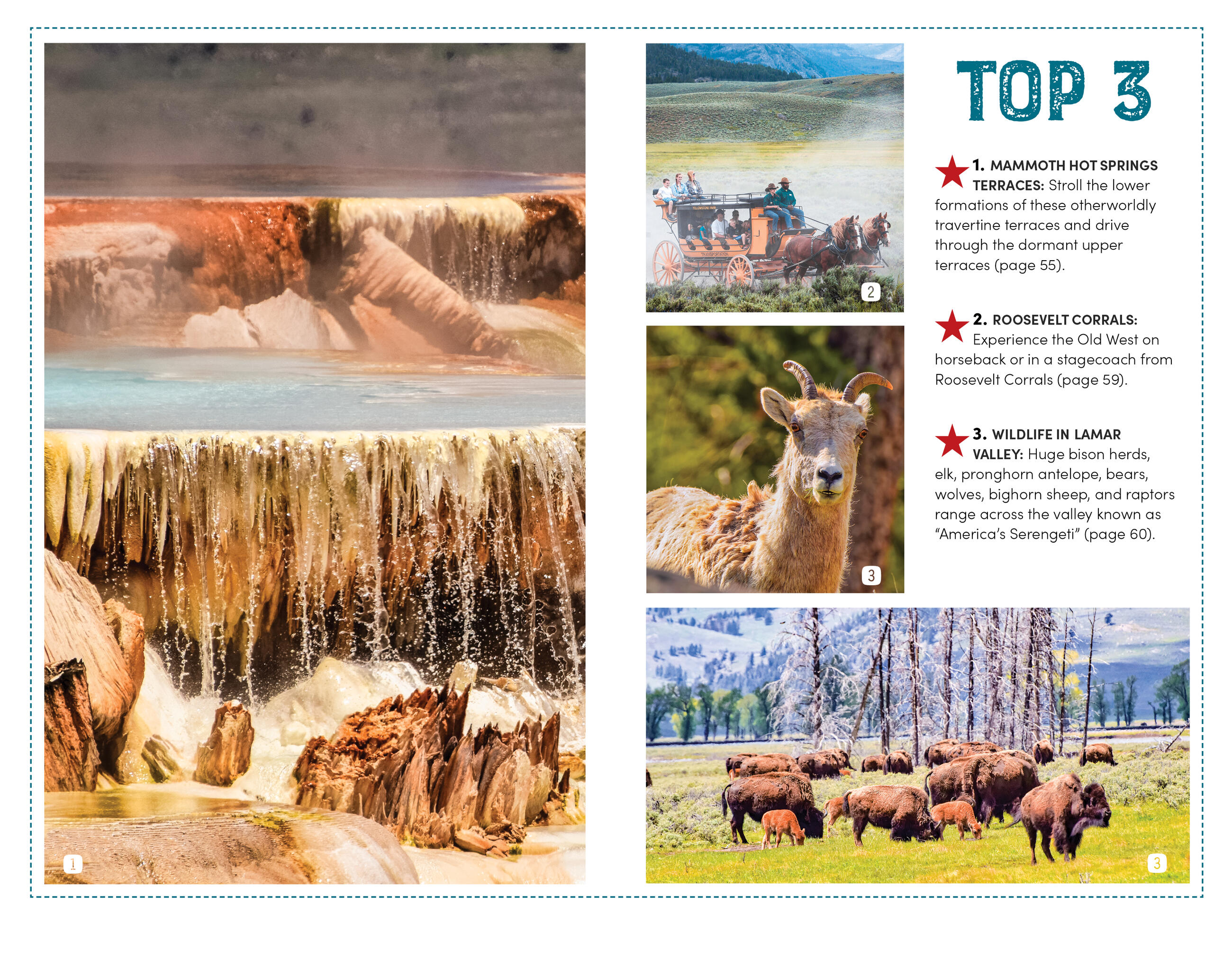 - Can’t-miss experiences: Make it the perfect getaway with the best lakes, views, picnic spots, and more. Hike through alpine forests to rushing waterfalls and panoramic lakeside views, or catch a glimpse of wild bison, elk, wolves, or bears. Bask in the colorful radiance of Grand Prismatic Spring or stroll the boardwalks along Mammoth Hot Springs