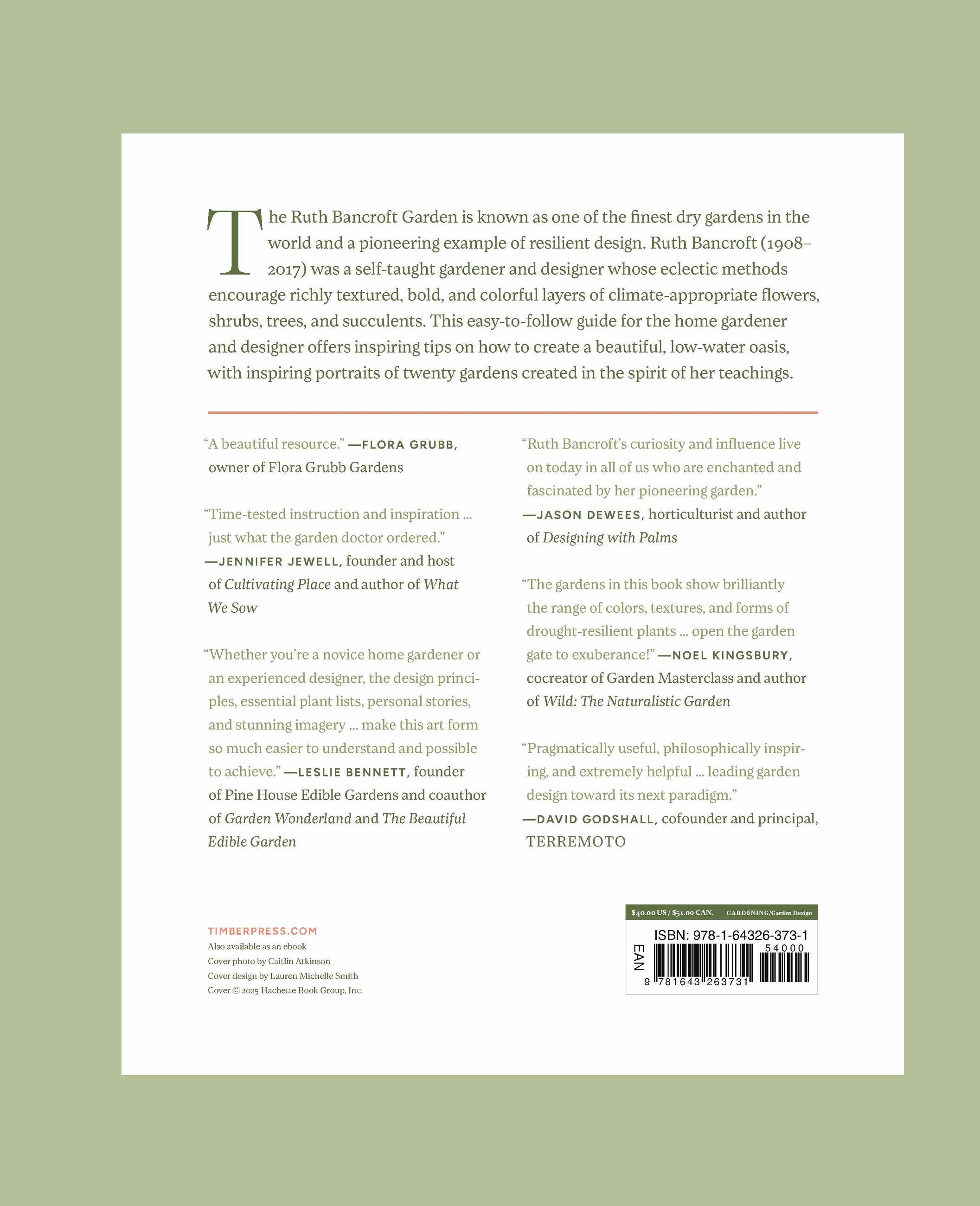 “Drawing on the wisdom of the late Ruth Bancroft, this book shows how to adapt her renowned dry garden principles to modern landscapes. It demonstrates how these ideas can transform real-life spaces into thriving, beautiful sanctuaries.”The American Gardener