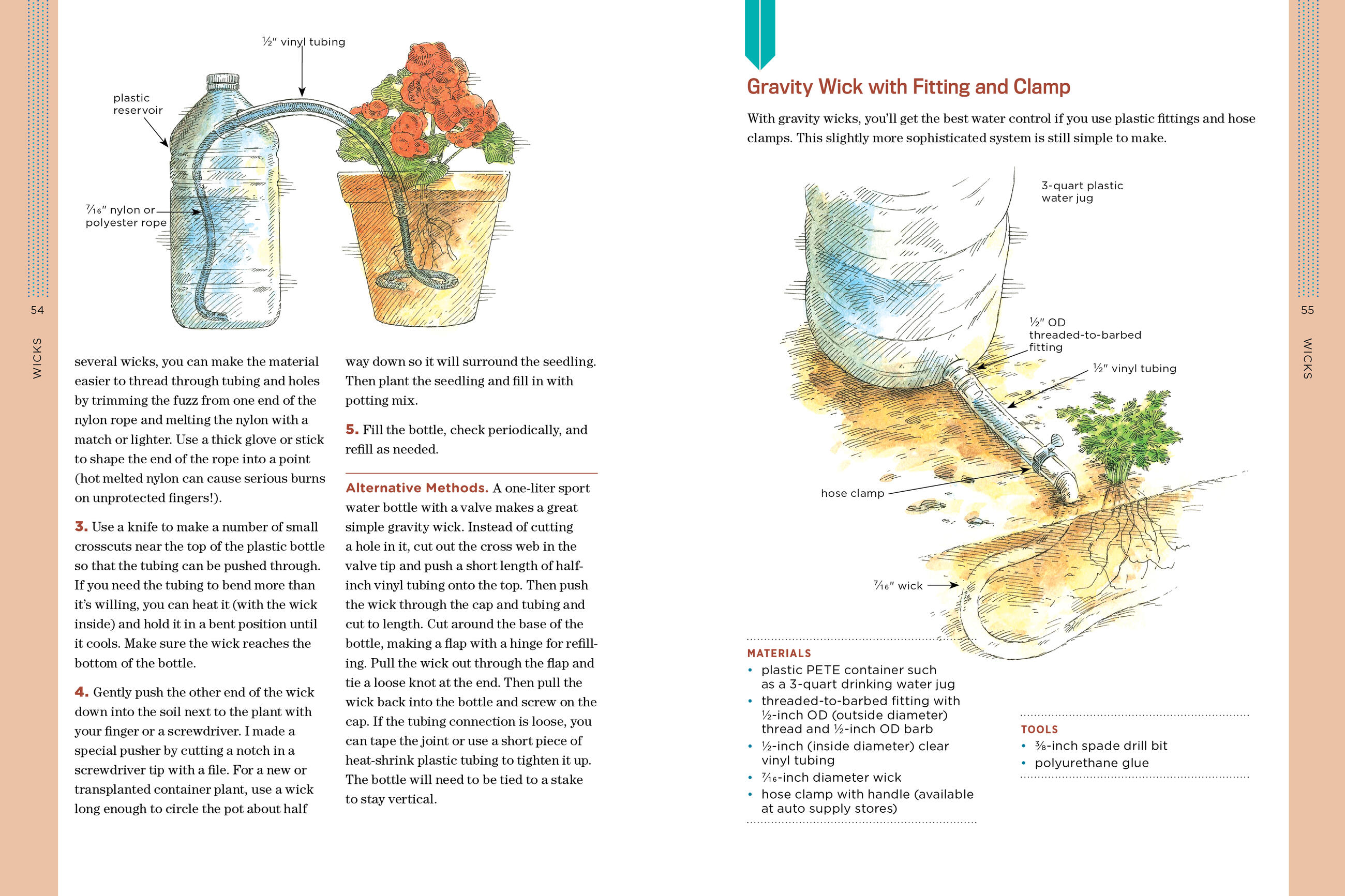 With illustrated step-by-step instructions, David Bainbridge shows you how to install buried clay pots and pipes, wicking systems, and other porous containers that deliver water directly to a plant’s roots with little to no evaporation. These irrigation systems are available at hardware stores and garden centers; are easy to set up and use; and work for garden beds, container gardens, and trees.