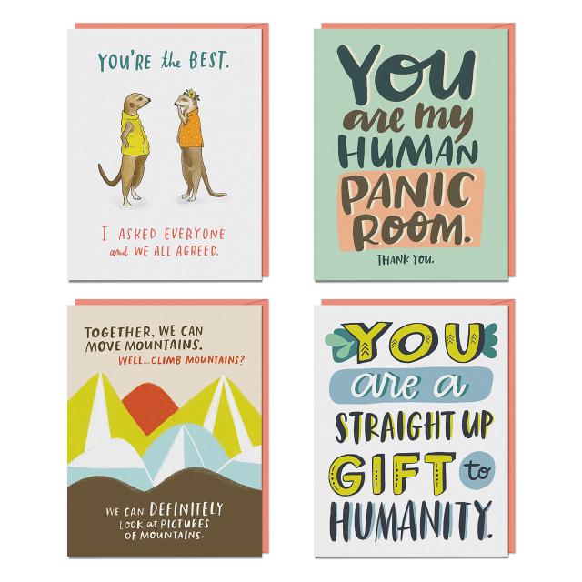 - Includes 4 heartfelt, celebratory, funny card designs