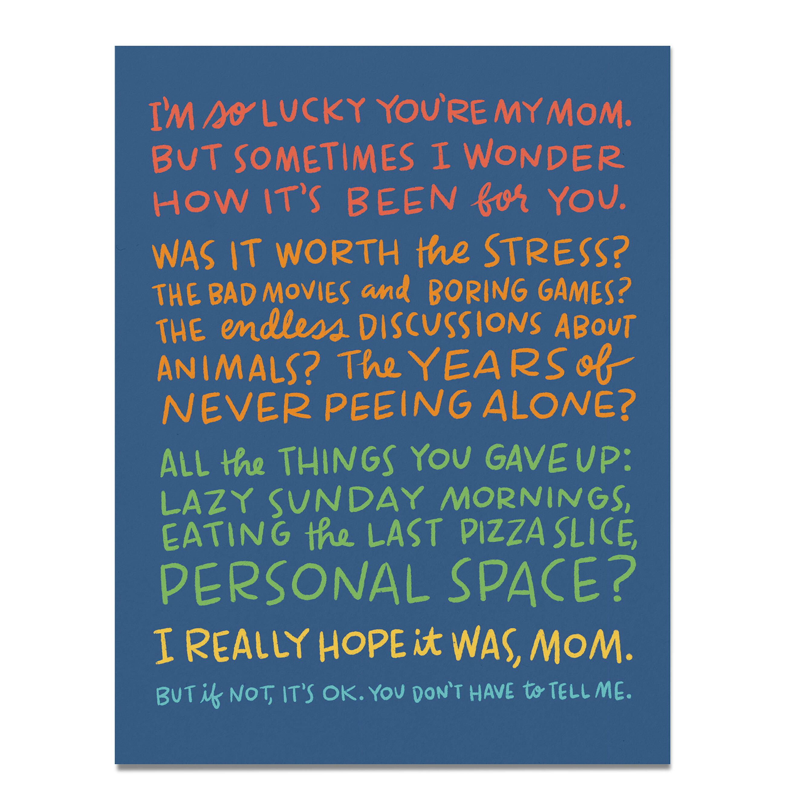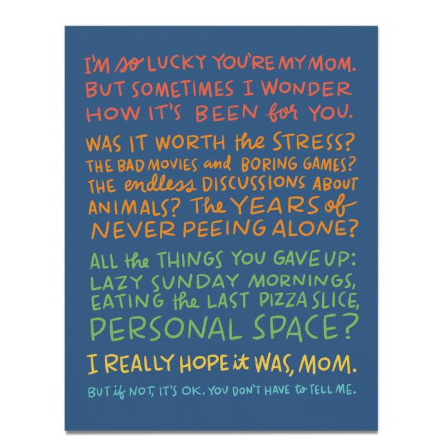 What nobody tells women before they give birth: being a good mom involves a shocking amount of tiresome games and tedious conversation. If you were lucky enough to have that kind of mom, please know: 1. You are very lucky. 2. She will freakin’ love this card.
