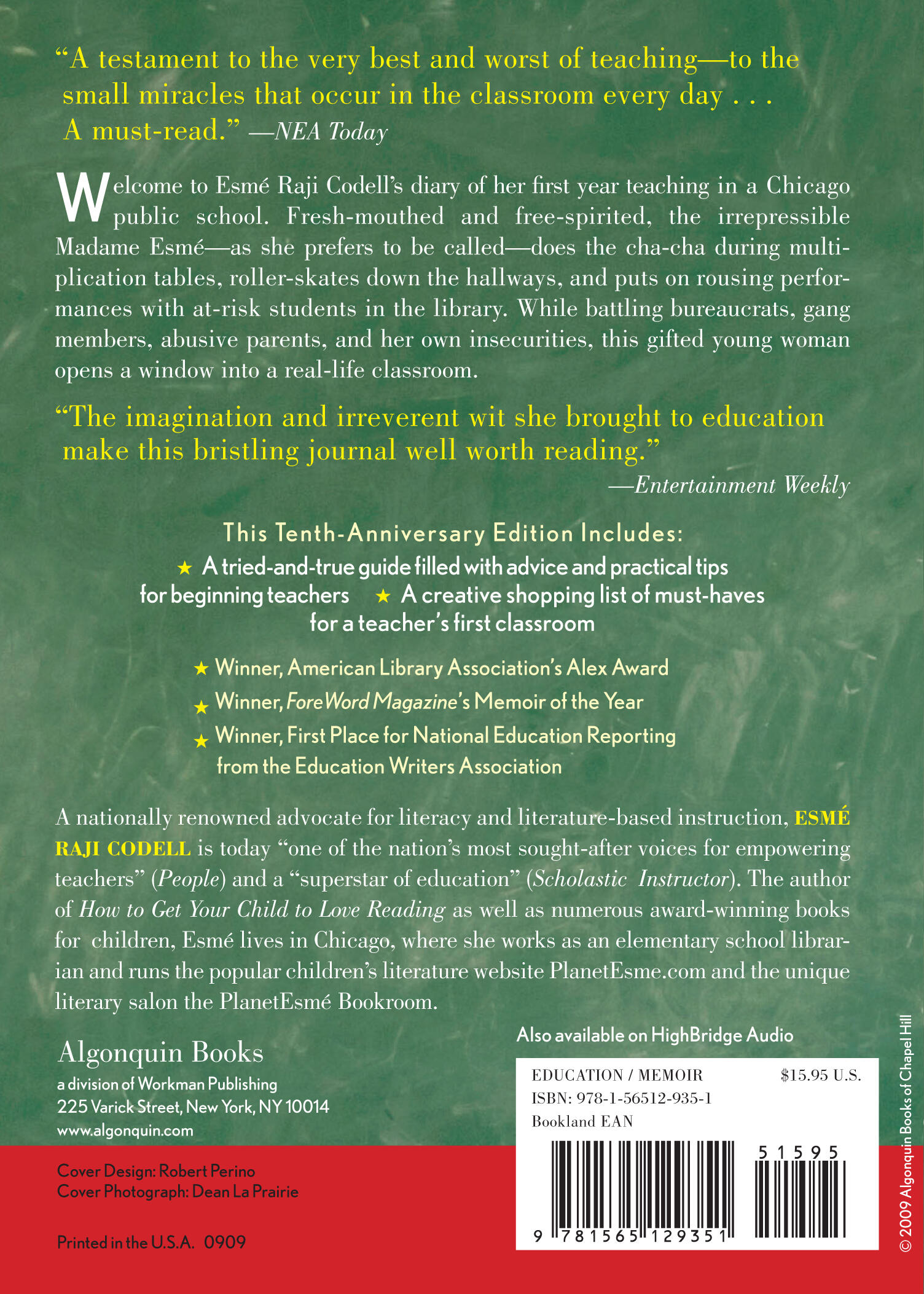A must-read for parents, new teachers, and classroom veterans, Educating Esmé is the exuberant diary of Esmé Raji Codell’s first year teaching in a Chicago public school. Fresh-mouthed and free-spirited, the irrepressible Madame Esmé—as she prefers to be called—does the cha-cha during multiplication tables, roller-skates down the hallways, and puts on rousing performances with at-risk students in the library. Her diary opens a window into a real-life classroom from a teacher’s perspective. While battling bureaucrats, gang members, abusive parents, and her own insecurities, this gifted young woman reveals what it takes to be an exceptional teacher.