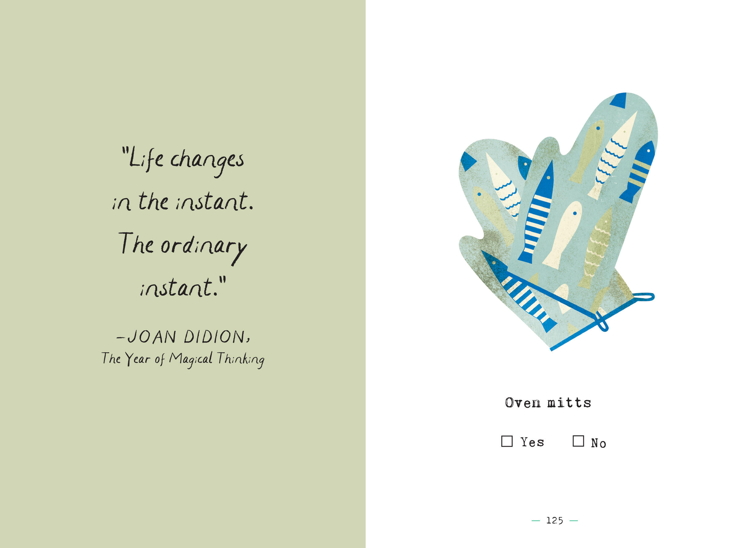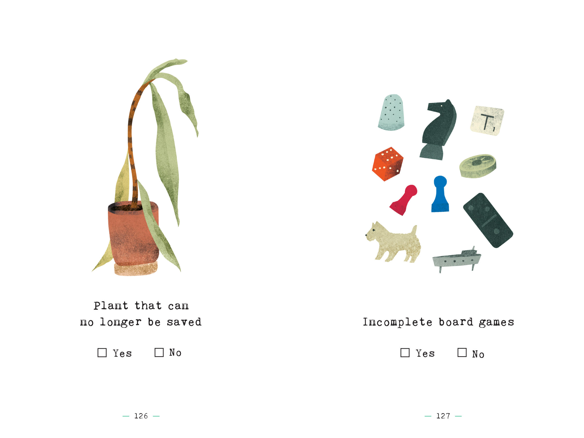 In this whimsical yet practical guide to sorting through the too-much-stuff of modern life, the premise is simple: on each page, a delightful illustration of items that fill our lives—novelty ice cube trays, a manual typewriter, game pieces, that souvenir snow globe. And beneath each drawing, two little checkboxes: Yes and No. Look at the object. Note your response. Act accordingly!