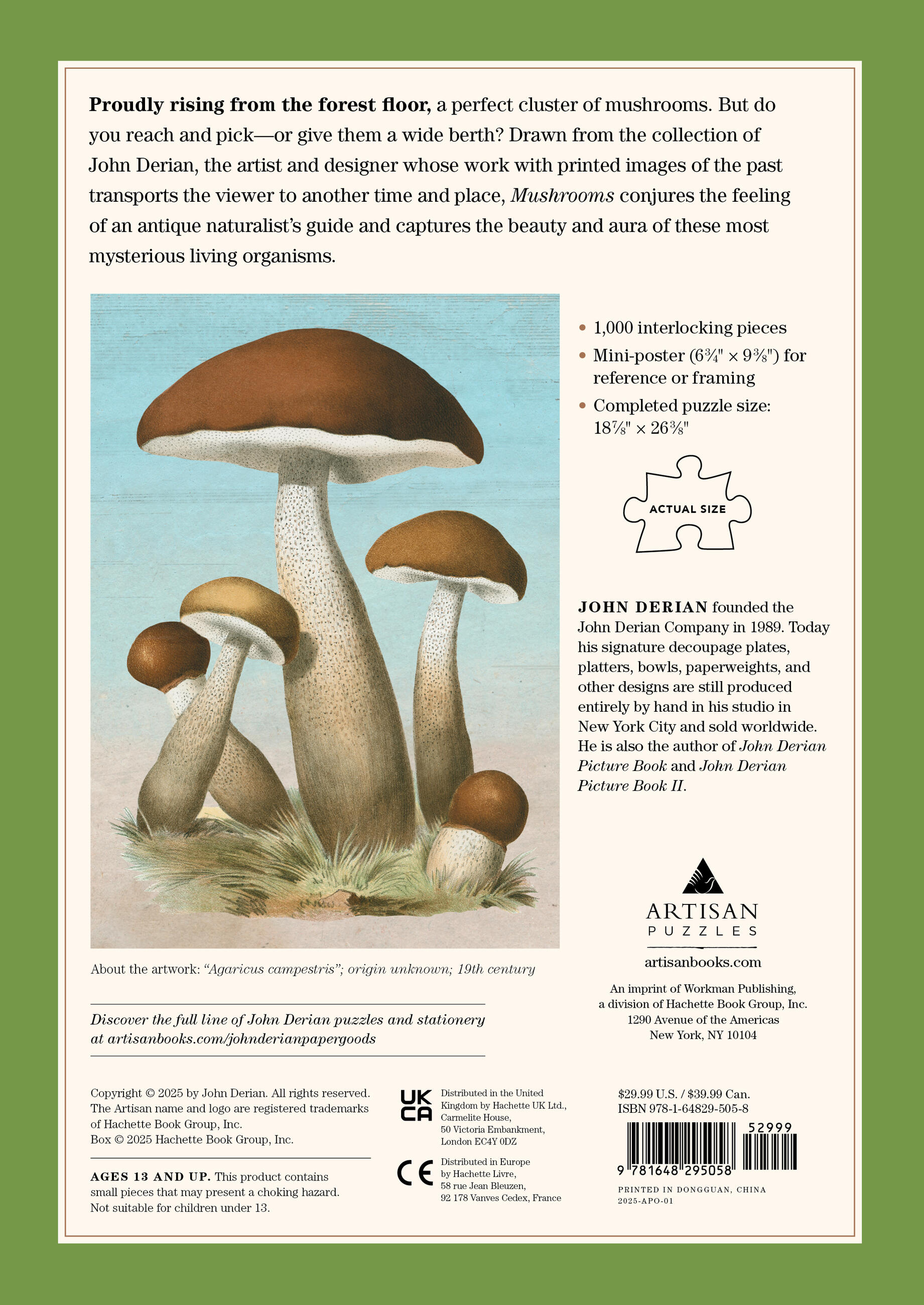John Derian is an artist and designer whose work with printed images of the past transports the viewer to another time and place. His puzzles are produced with great care and quality to ensure hours of pure pleasure, from spreading out the pieces to admiring the finished work. Featuring: