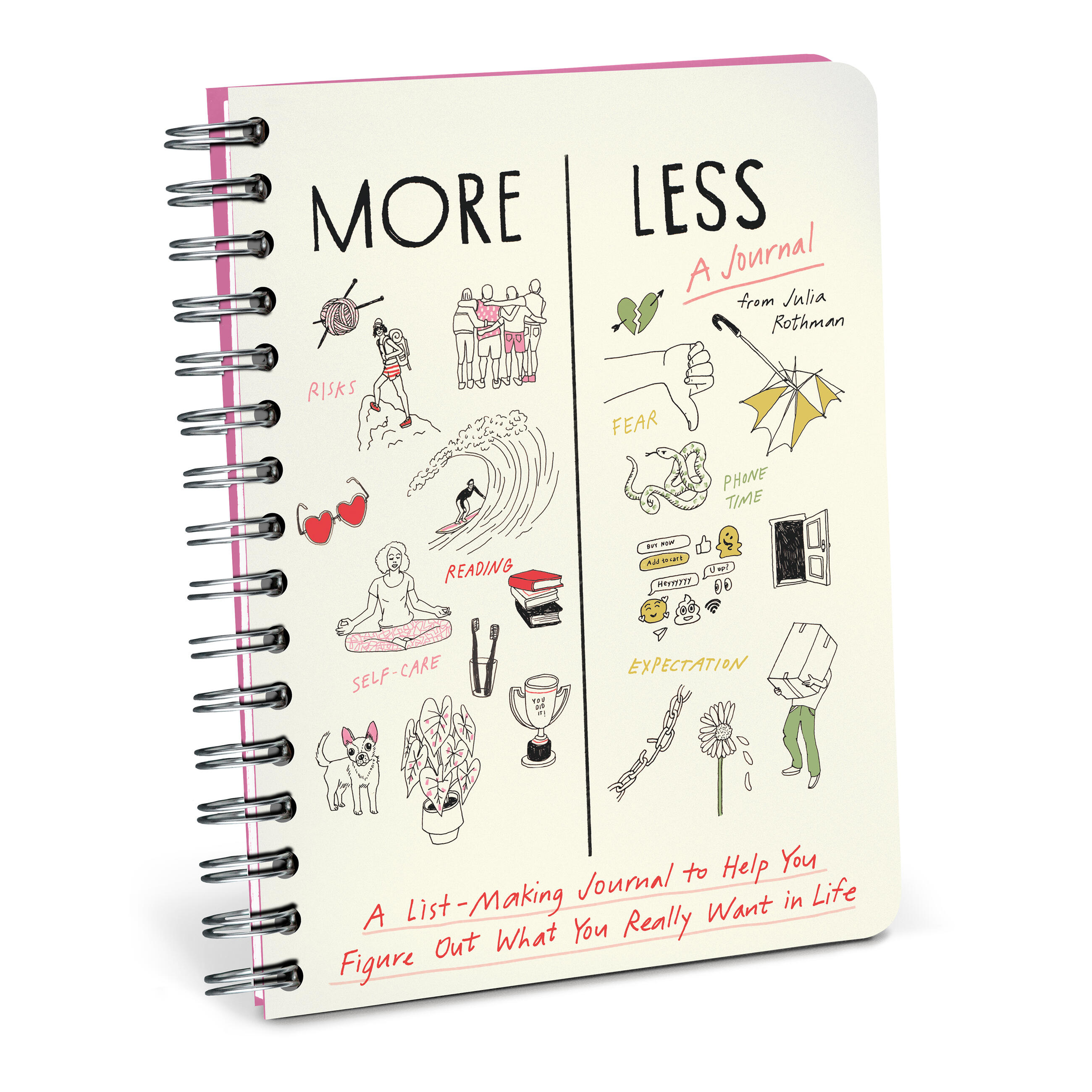List-make (or draw, or doodle!) your way to your ideal existence with a fresh, no-pressure approach to goal setting. Deciding what you want MORE or LESS of in your life is a creative and easy way to figure yourself (and your shizz) out. From the creative brain of artist and New York Times columnist Julia Rothman, this fun, low-key journal helps you clarify what you’d like to invite (and un-invite) into your life. With topics like relationships, food, and travel + many, many more, you’ll find yourself listing your way to a fulfilling and more intentional life in no time. This beautifully illustrated journal created with list-makers, creative types, and journal lovers in mind.