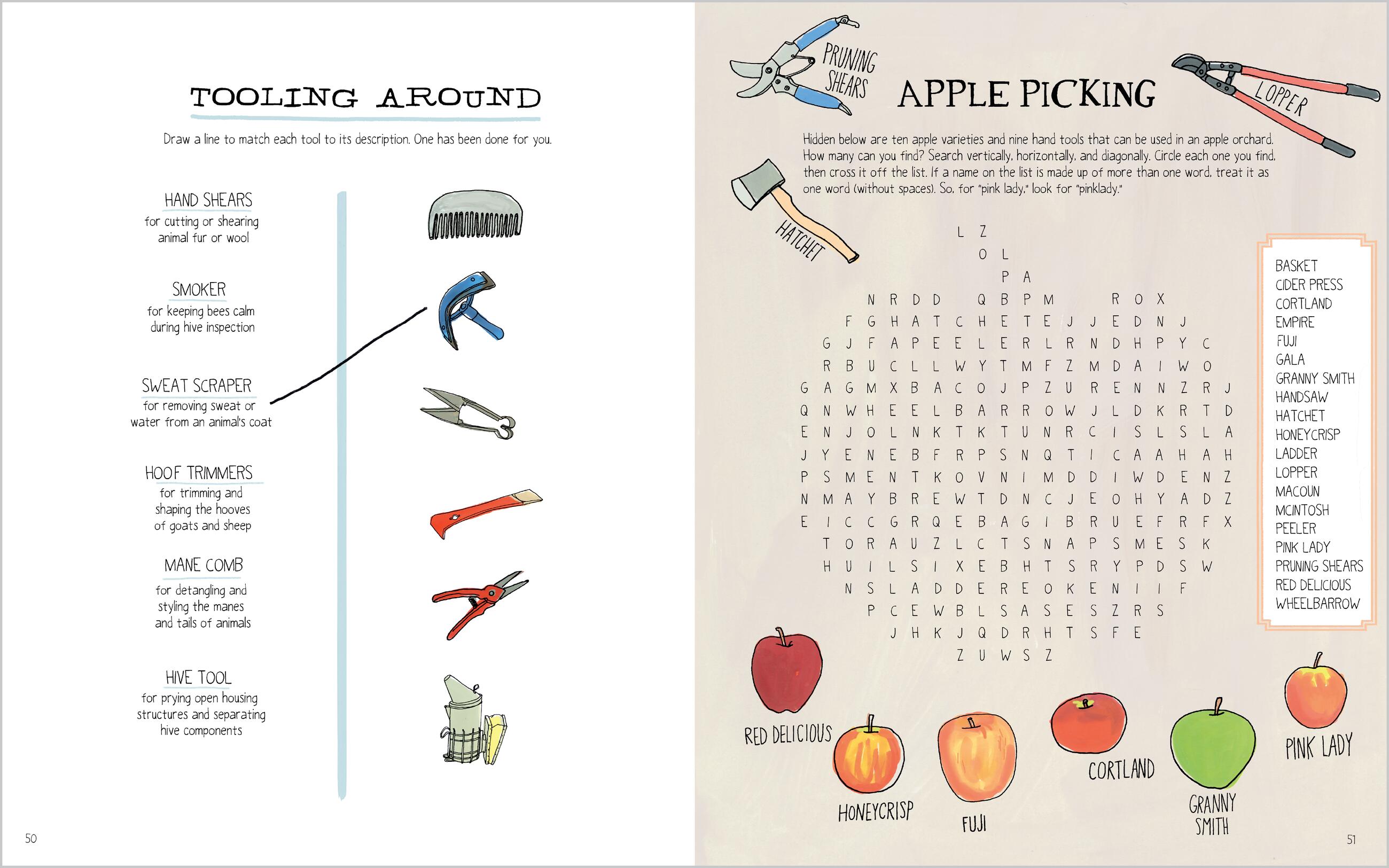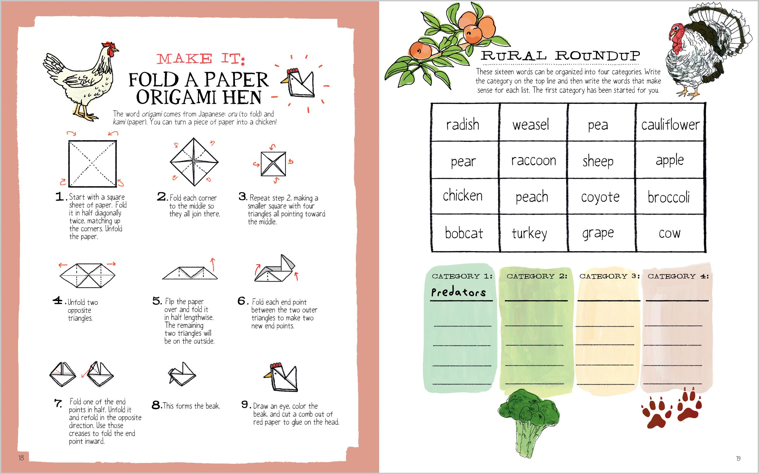 The author invites you to try your hand at identifying, drawing, and learning the parts and pieces of life on a farm. Loaded with Rothman’s original illustrations, this interactive format features fun challenges on every page, including labeling the parts of a rabbit, buzzing though a pollinator’s maze, figuring out a secret farm code, identifying tools and equipment, and learning to draw a sheep and a horse. Rothman’s lively collection of on-the-page quizzes, puzzles, and activities will intrigue and entertain you, whether you live on a farm or not.