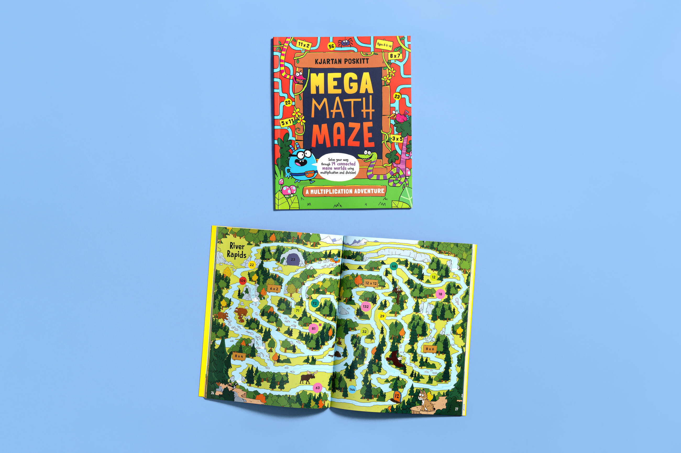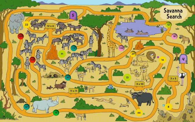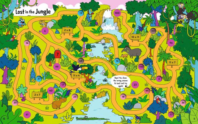 Readers explore a variety of maze worlds, solving multiplication facts and navigating pathways and portals through pages as they complete a quest to restore numbers to a multiplication chart. Mega Math Maze leads students through a jungle, up a mountain, into a cave, and through other adventurous terrains. To complete the quest and make their way through the book, students must solve multiplication facts and follow pathways to the right answers. And just when the adventurers complete their quest, they’re tasked with another quest to journey back through the maze via alternate paths using division and secret doors in search of a mystery sign.