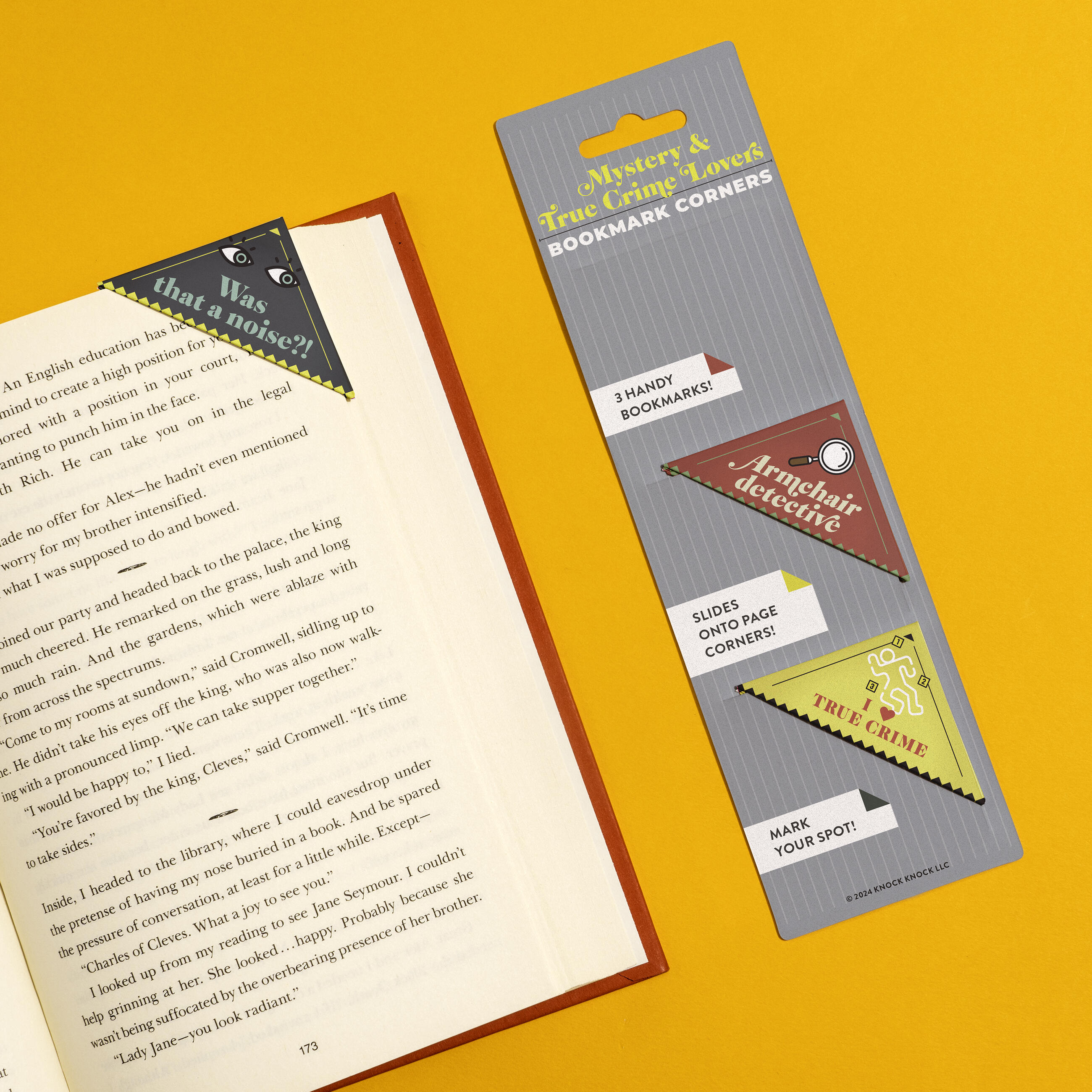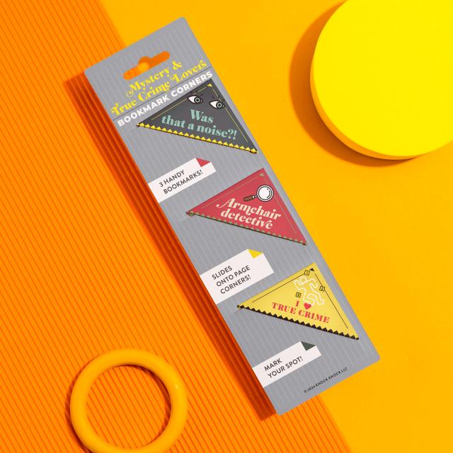 Book lovers agree: you can never have too many books . . . or bookmarks! These unique corner bookmarks hold your spot, prevent dog-ears, and let you self-identify as mystery maven & crime connoisseur!