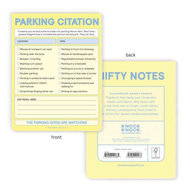 Strike a blow for curbside justice with our Parking Citation Nifty Note—spiffed up and back by popular demand! This official-ish funny parking ticket charges offenders with infractions from wasting curb space to leaving a pet in their car, and remind them that they’re being watched—and judged.