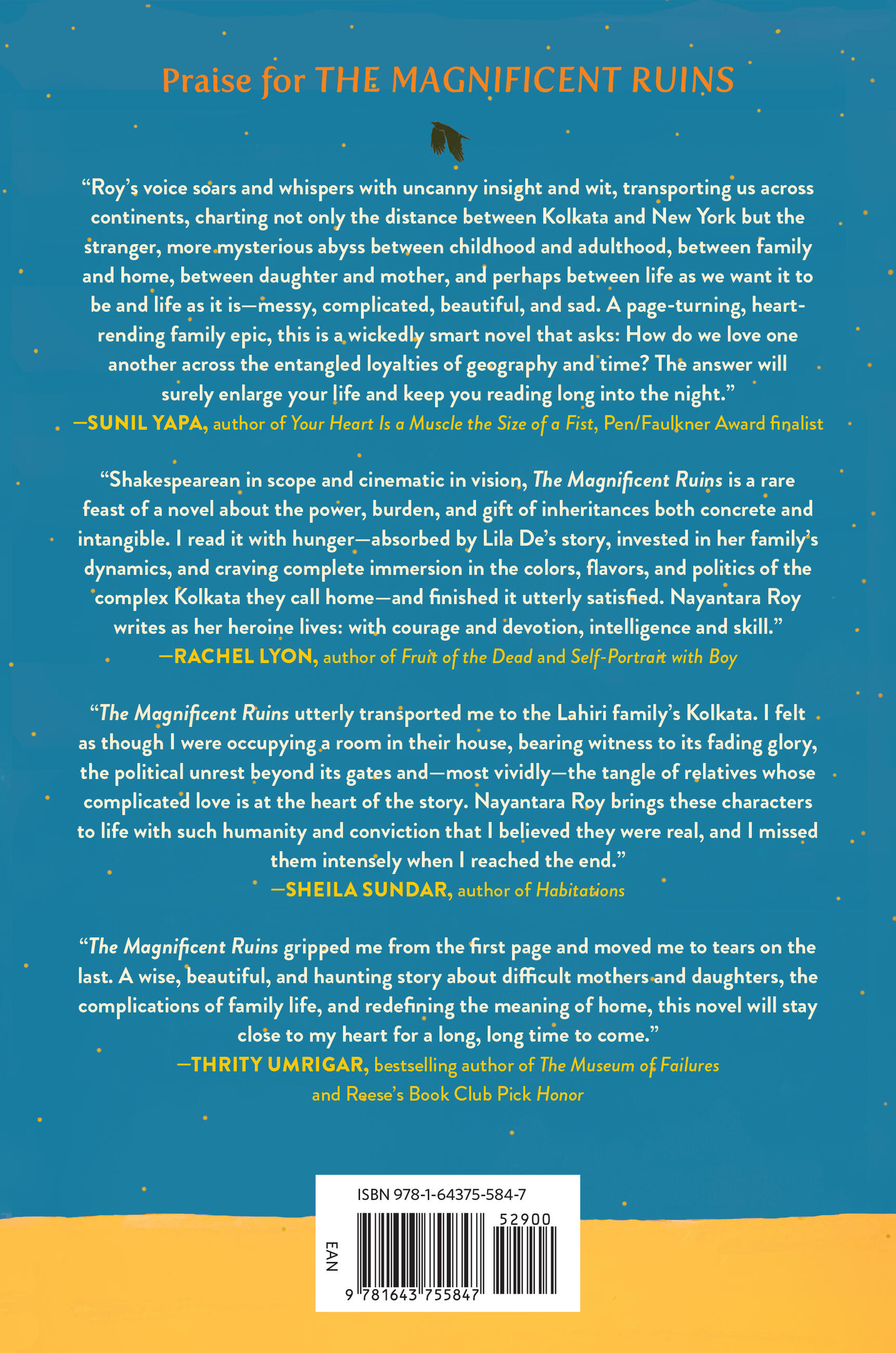 “The Magnificent Ruins gripped me from the first page and moved me to tears on the last. A wise, beautiful and haunting story about difficult mothers and daughters, the complications of family life, and redefining the meaning of home, this novel will stay close to my heart for a long, long time to come.”Thrity Umrigar, bestselling author of Honor and The Museum of Failures