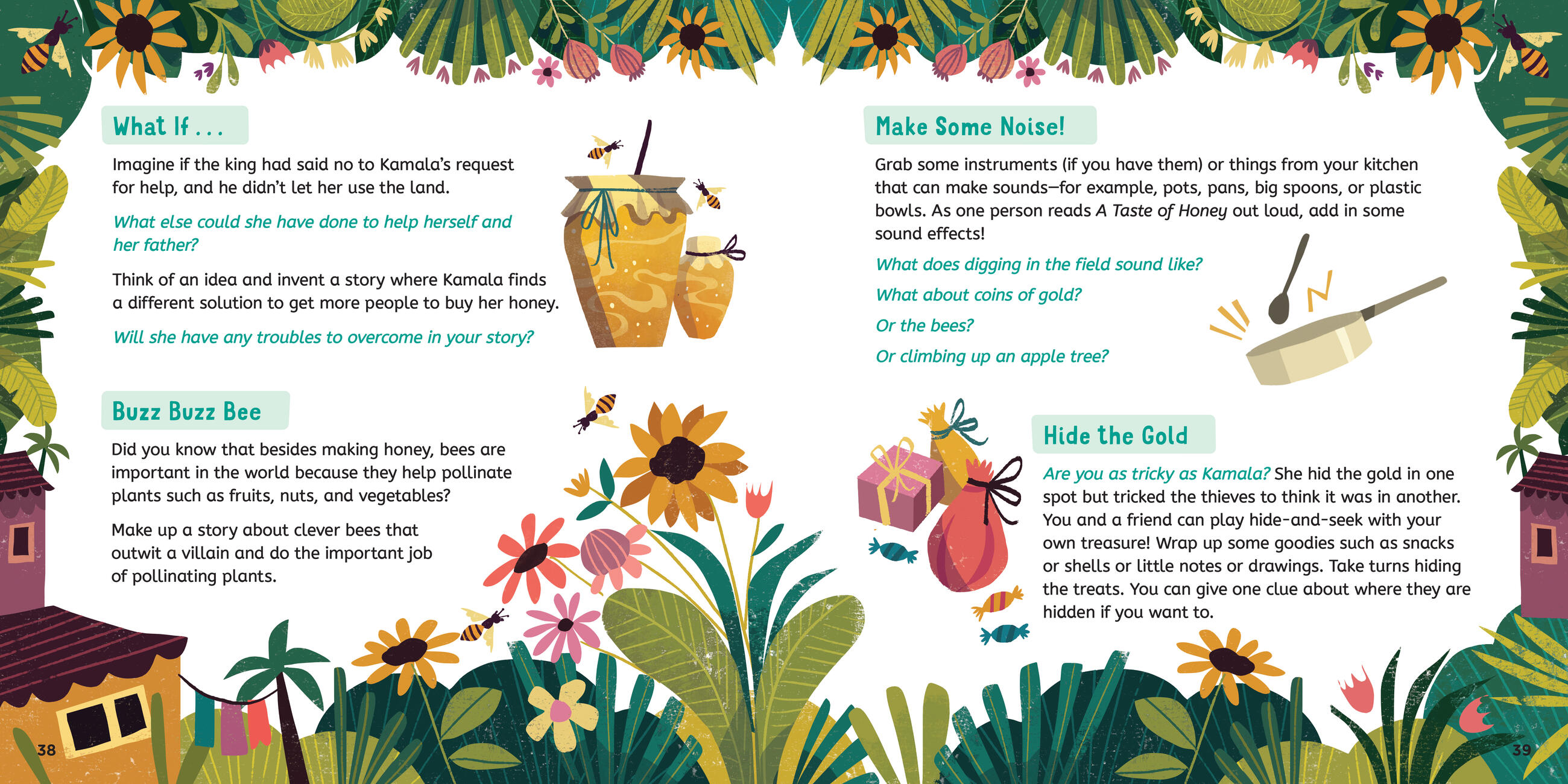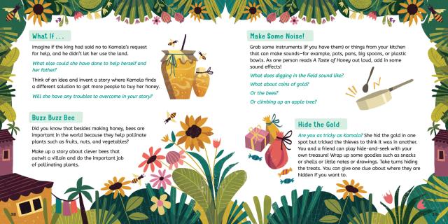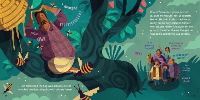 In a village in the countryside lived a woman named Kamala who had the most delicious honey you’ve ever tasted. She collected honey from her hives to sell at the market, but business was slow, and she and her father were struggling to get by. Kamala knew she had to do something, so when she heard that the king’s son was getting married and all the villagers were invited to the party, she got an idea.