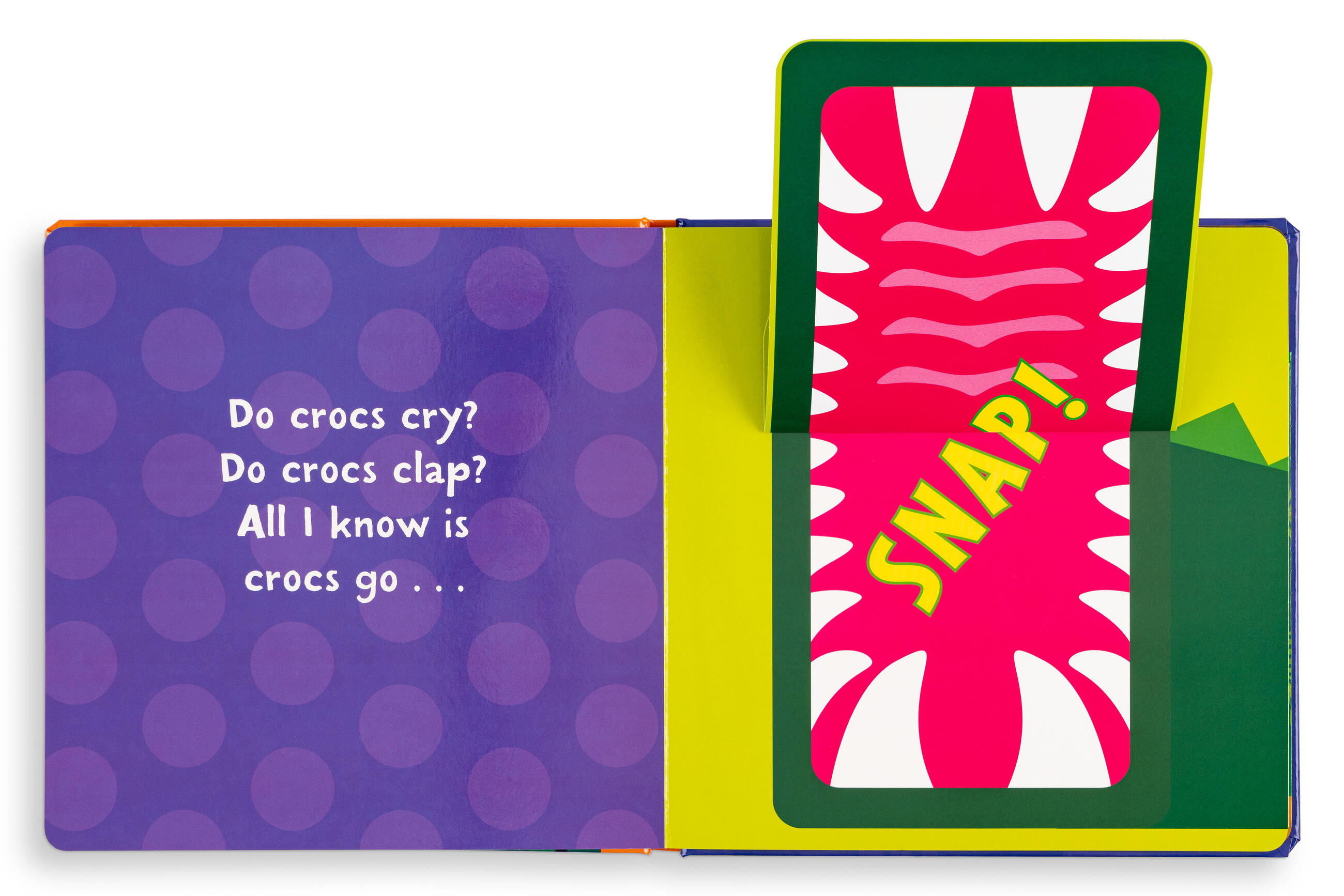 Do crocs cry? Do crocs clap? All I know is crocs go . . . SNAP! This novelty board book, with fun text and colorful illustrations, features adorable lions, tigers, and bears, as well as the snappy title reptile and other favorite creatures. Kids will happily lift the flap on each big animal “mouth” to discover what sound it makes. For a grand finale, all the animals appear together peering out from behind two gatefolds, so children can sneak a peek and say all the sounds again!