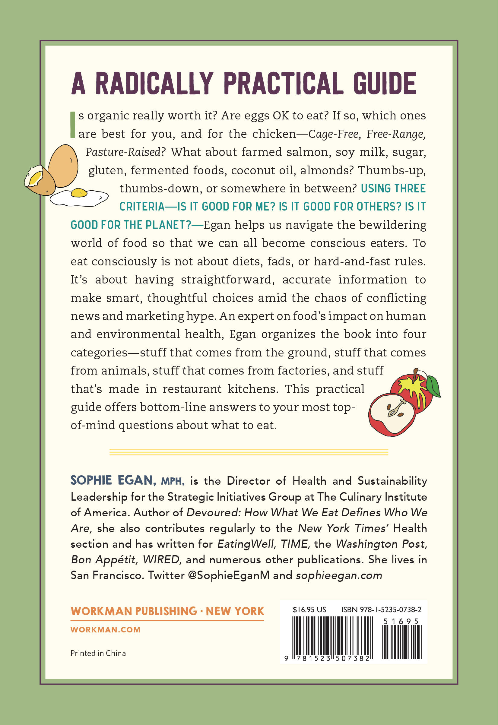 Using three criteria—Is it good for me? Is it good for others? Is it good for the planet?—Sophie Egan helps us navigate the bewildering world of food so that we can all become conscious eaters. To eat consciously is not about diets, fads, or hard-and-fast rules. It’s about having straightforward, accurate information to make smart, thoughtful choices amid the chaos of conflicting news and marketing hype. An expert on food’s impact on human and environmental health, Egan organizes the book into four categories—stuff that comes from the ground, stuff that comes from animals, stuff that comes from factories, and stuff that’s made in restaurant kitchens. This practical guide offers bottom-line answers to your most top-of-mind questions about what to eat.