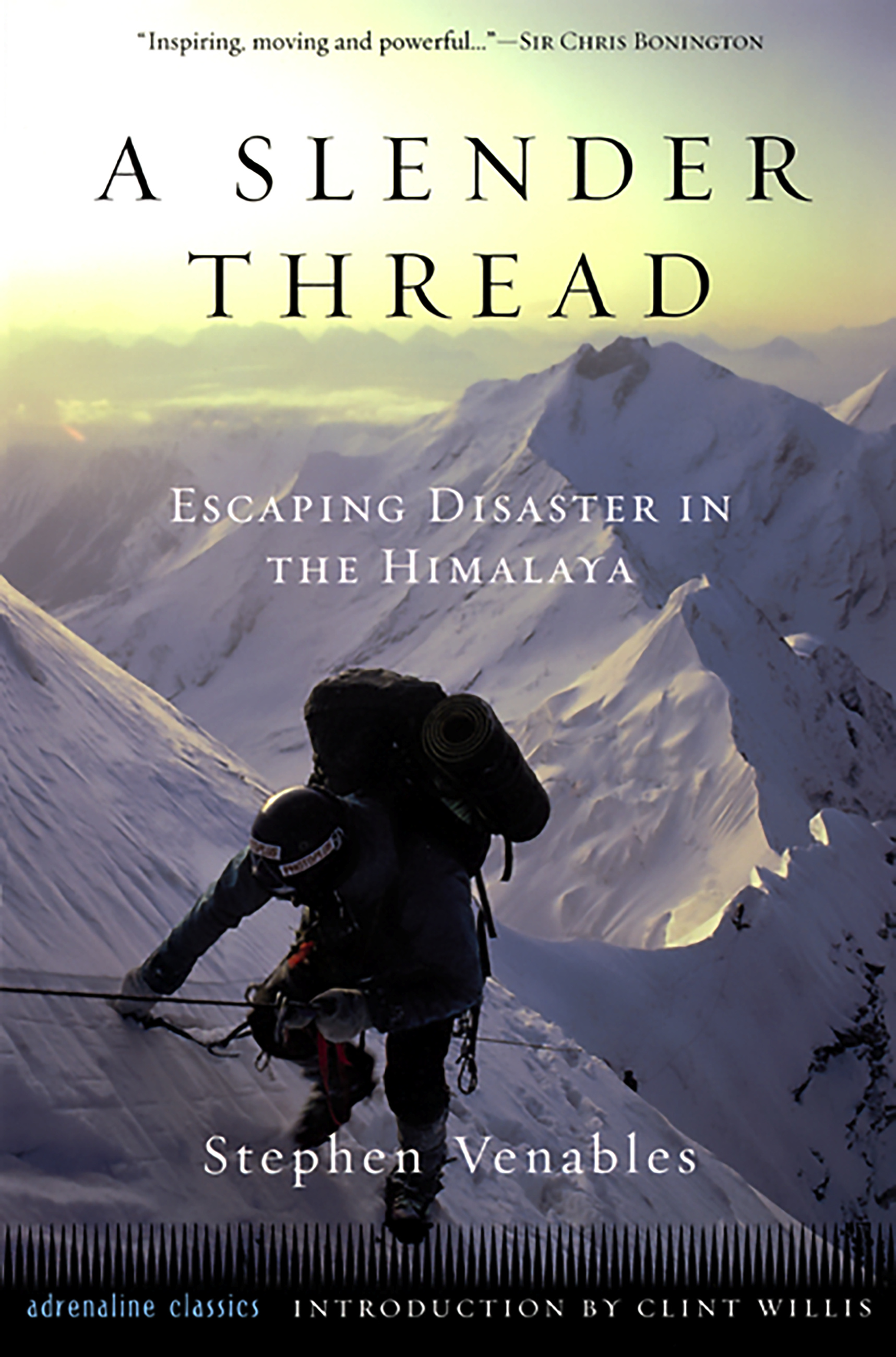 Stephen Venables and three companions made the first ascent of Panchu Chuli Va remote Himalayan peak on the borders of India, Nepal and Tibet. A rappel anchor failed on the descent, pitching Venables into a 300-foot fall. Crashing through the black night, flung from rock to rock, he assumed that he was plunging to his death. Against all odds he survived, but was left stranded 19,000 feet above a labyrinth of glaciers and snow slopes with two broken legs, the threat of gangrene, and scant food or medical supplies. If he was to return to his wife and son waiting at home some 5000 miles away, Venables knew he had to draw on his reserve of courage and determination. The third Adrenaline Classic, A Slender Thread is a spellbinding account of Venables’ survivaland his intense personal struggle to understand the risks he takes for the sake of his insatiable passion for climbing. He comes as close to anyone to answering the unanswerable question: Why do they do it?