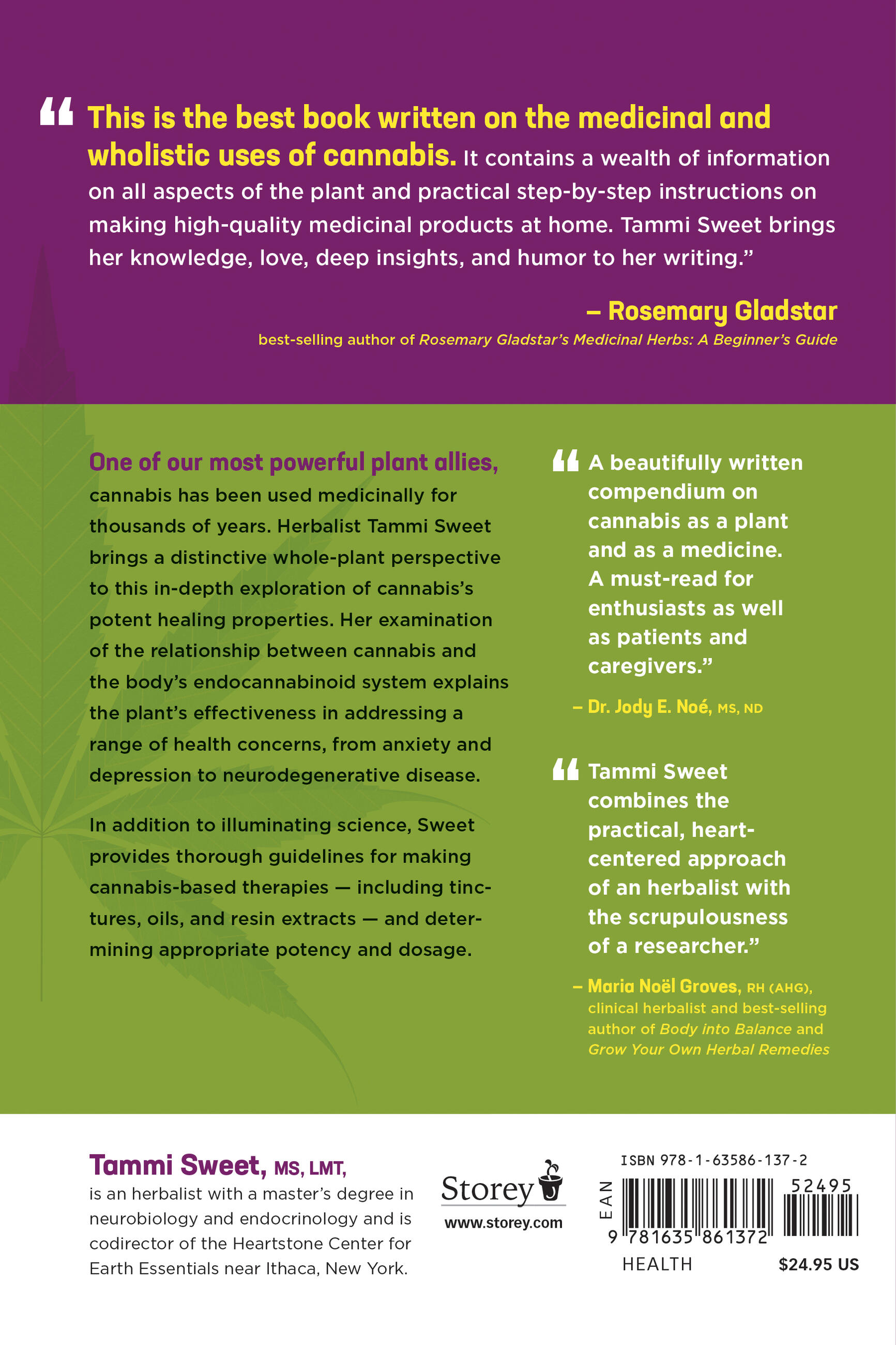 “Finally, a trustworthy cannabis book! Tammi Sweet combines the practical, heart-centered approach of an herbalist with the scrupulousness of a researcher to craft a book that is profoundly useful and richly informative. She empowers readers to make potent medicine in their own kitchens and has the knowledge to explain why homemade medicine will likely be safer and more effective than expensive isolates sold in dispensaries.” — Maria Noël Groves, RH (AHG), clinical herbalist and best-selling author of Body into Balance and Grow Your Own Herbal Remedies
