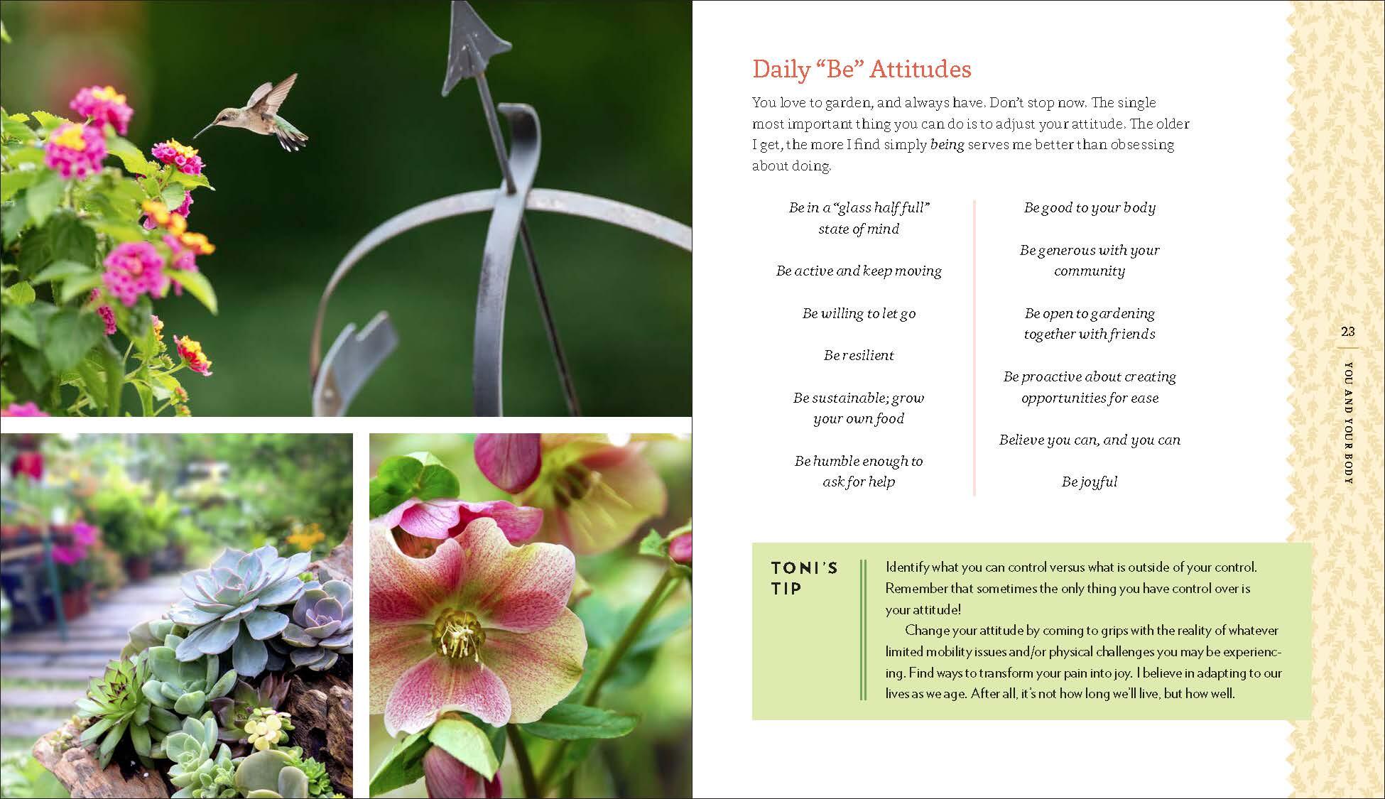 “Toni’s ways for adapting to older, less-flexible bodies are practical, and the projects are useful. Don’t miss out on a favorite lifelong activity—adapt just a little.” B>Ruth Rogers Clausen, horticulturist, lecturer, and co-author of Essential Perennials and Proven WinnersCottage in the Court