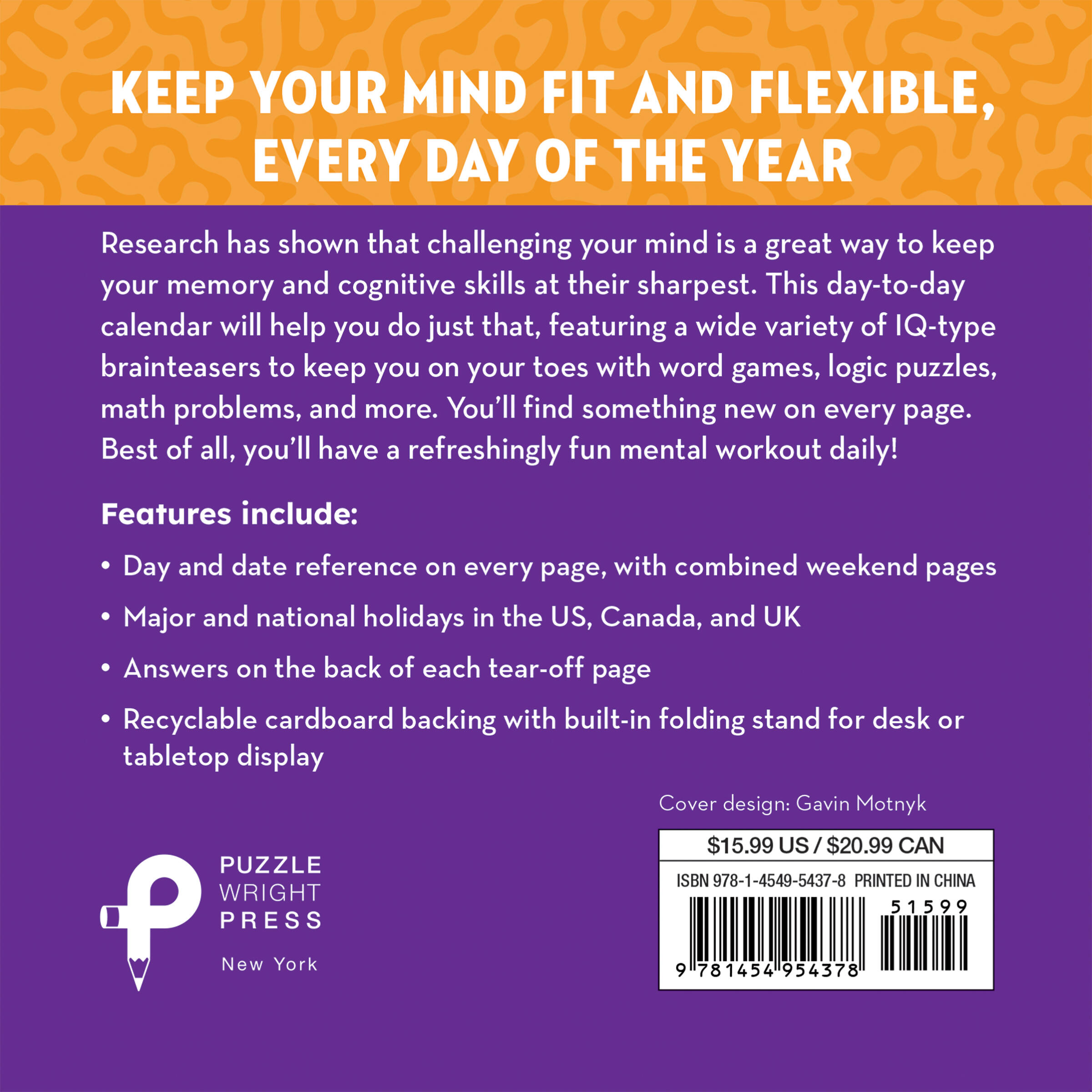 Take advantage of the moment by grabbing this calendar and testing your wits against a variety of brainteasers that require a diverse set of skills. Research has shown that a great way to keep your memory and cognitive skills at their best is to learn challenging new things that require you to think. This day-to-day calendar is perfect for doing just that, since it features a wide variety of IQ-type brainteasers to keep solvers on their toes: different types of word games, memory tests, logic puzzles, and math problems, with something new on every page. It’s a refreshingly fun mental workout!