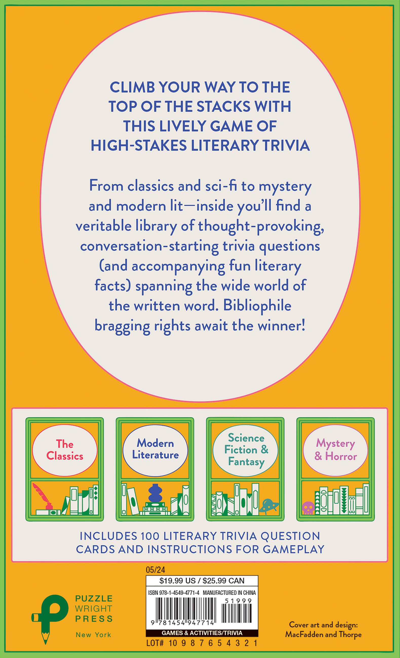 Check Your Shelf features 100 game cards divided into four color-coded genre categories with multiple-choice questions: Classics (pre-20th-century literature) Modern Literature (20th and 21st century works), Mystery/Horror, and Sci-Fi/Fantasy. The package itself, featuring a hinged lid and a curved “spine,” evokes an actual book.