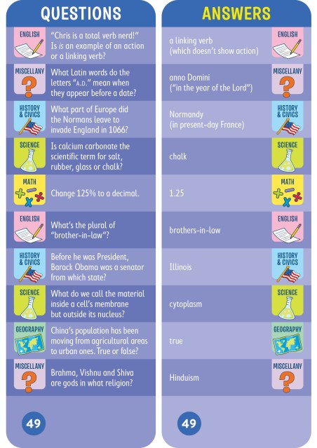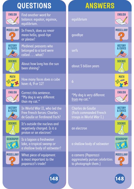 - 1,500 questions and answers covering math, science, English, history, geography, and more