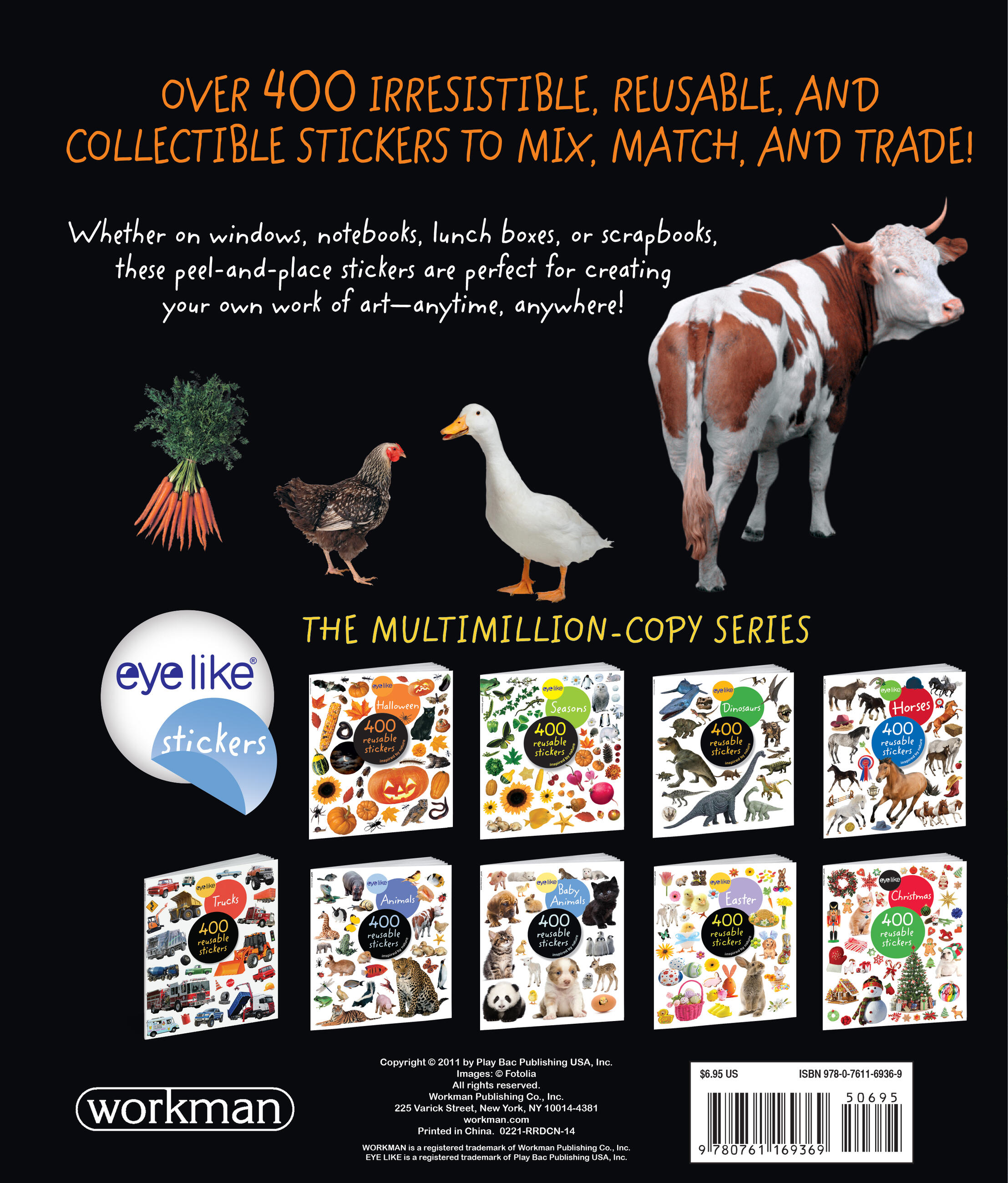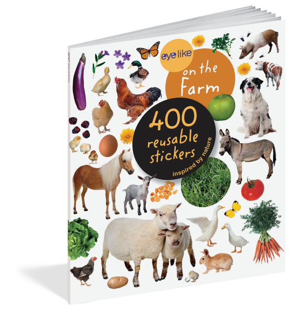 The full-color photographic stickers feature cute farm animals like lambs, pigs, horses, ducks, and more, plus a vibrant variety of farm-fresh fruits and veggies. Whether on windows, notebooks, lunch boxes, or scrapbooks, these peel-and-place stickers are perfect for creating your own work of art anytime, anywhere, and are designed to be stuck on, peeled off, and stuck on again without tearing or losing their “stick.” The books’ inside covers are glossy illustrated backgrounds on which kids can create lively and original sticker scenes―and then change them whenever they like.