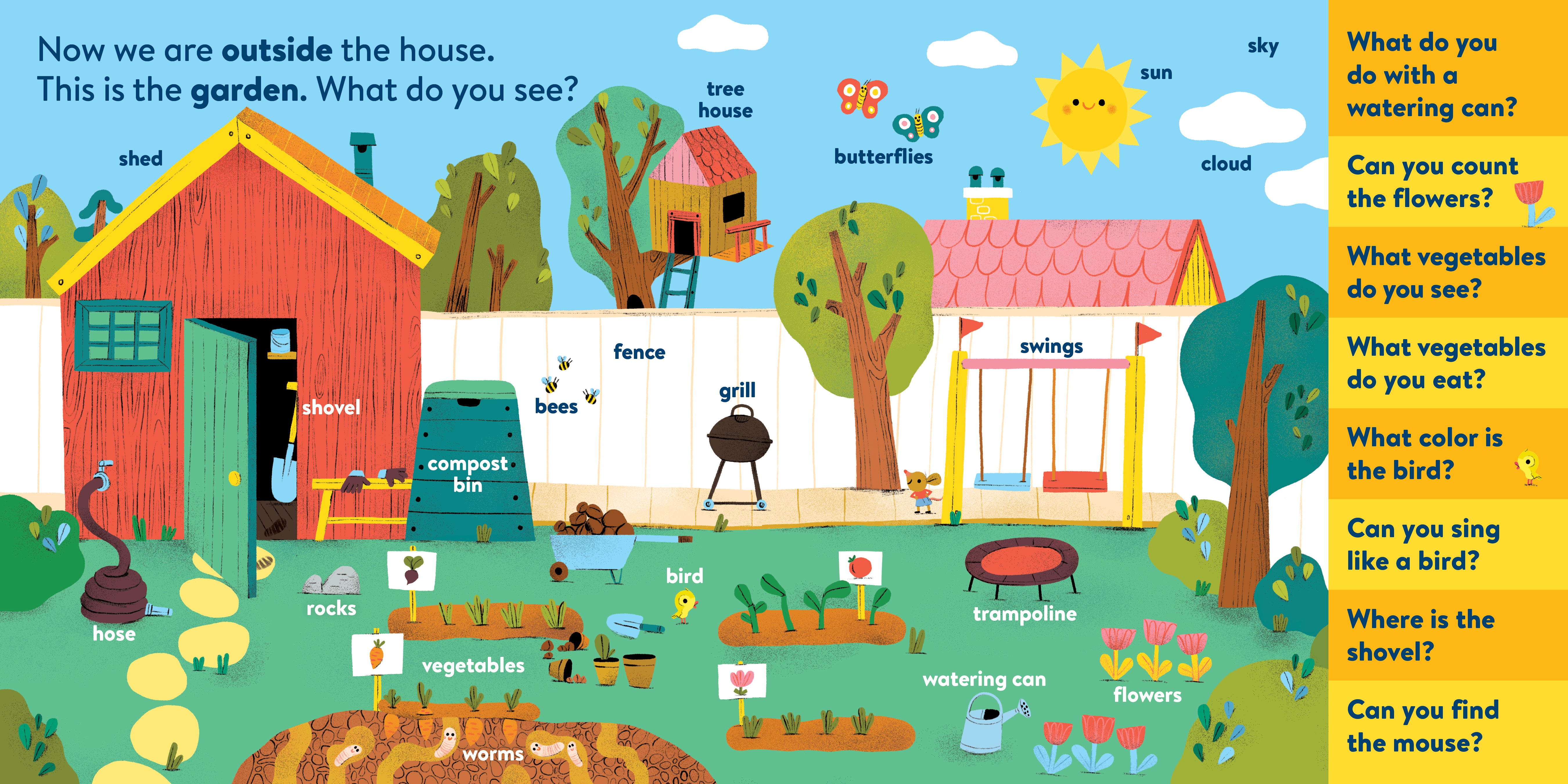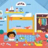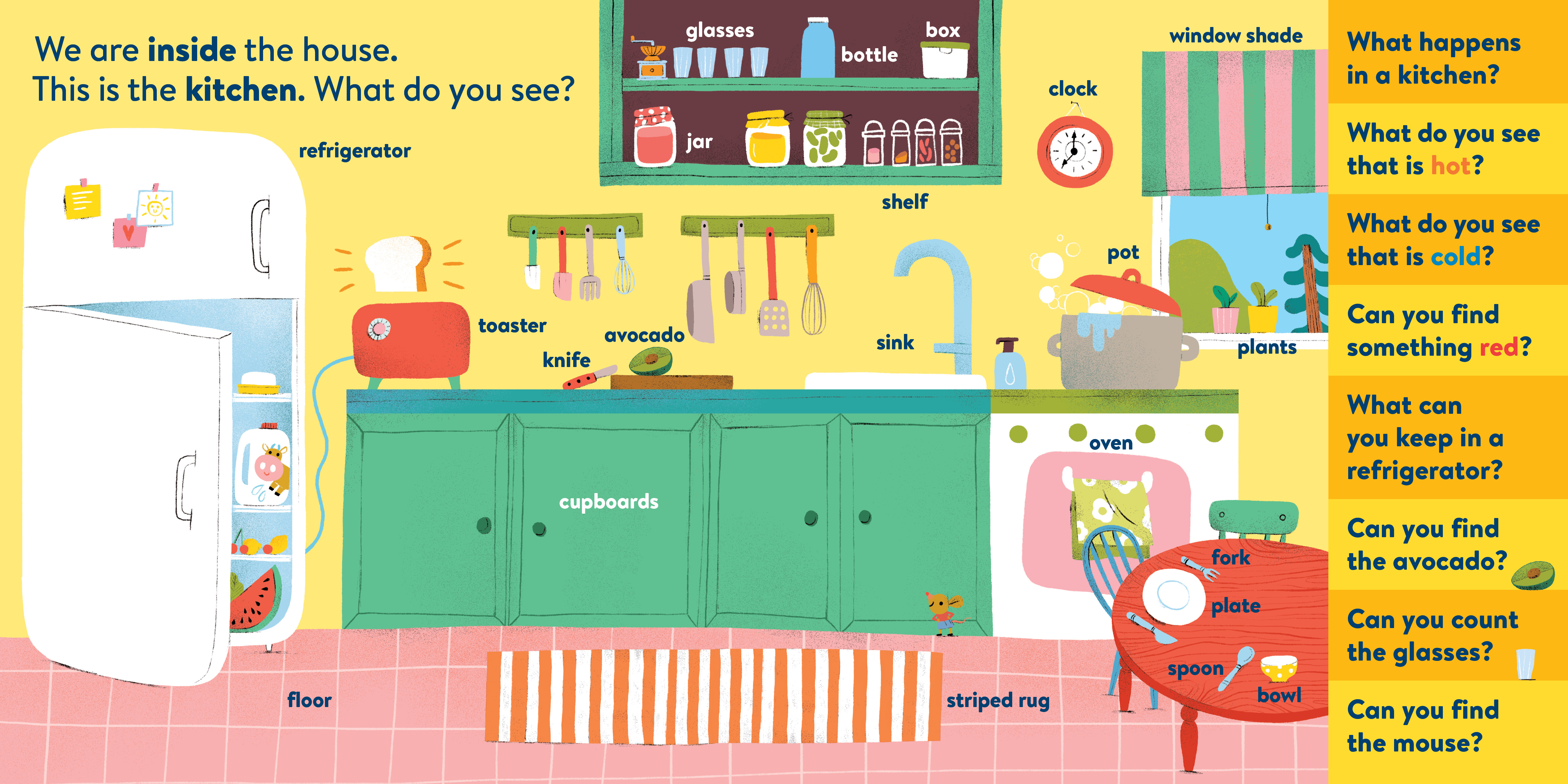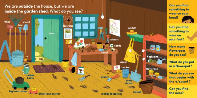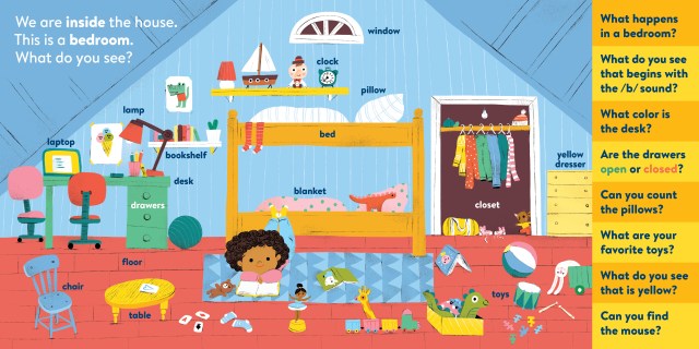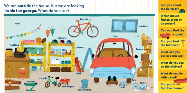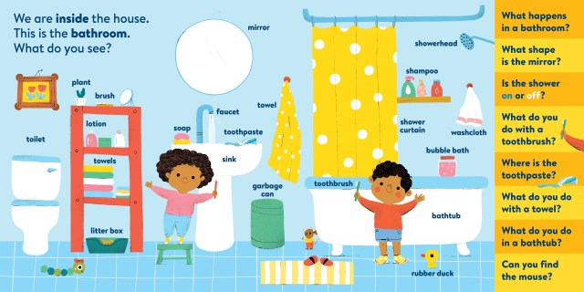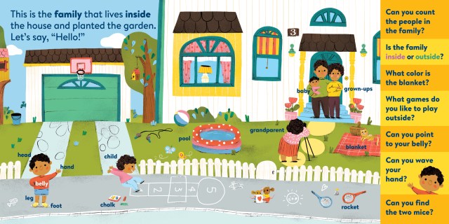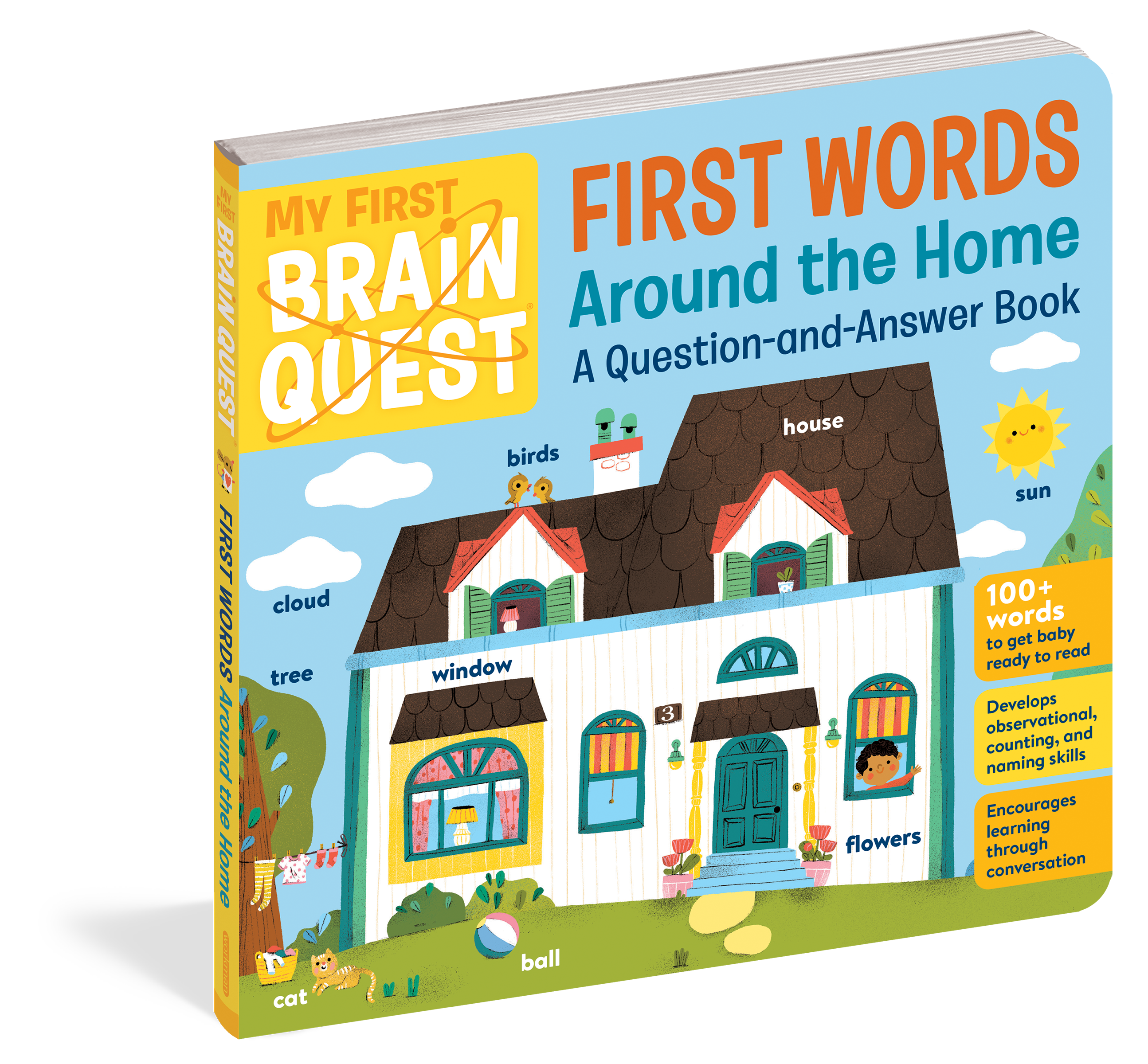 My First Brain Quest First Words: Around the Home introduces babies and toddlers to more than 100 foundational vocabulary words from scenes in and around a cozy, colorful family home—from the kitchen to the bathroom to the garden. In addition to labeled illustrated objects, each scene has questions that help reader and child talk about what they see on the page. There’s counting, colors, comparison and more!