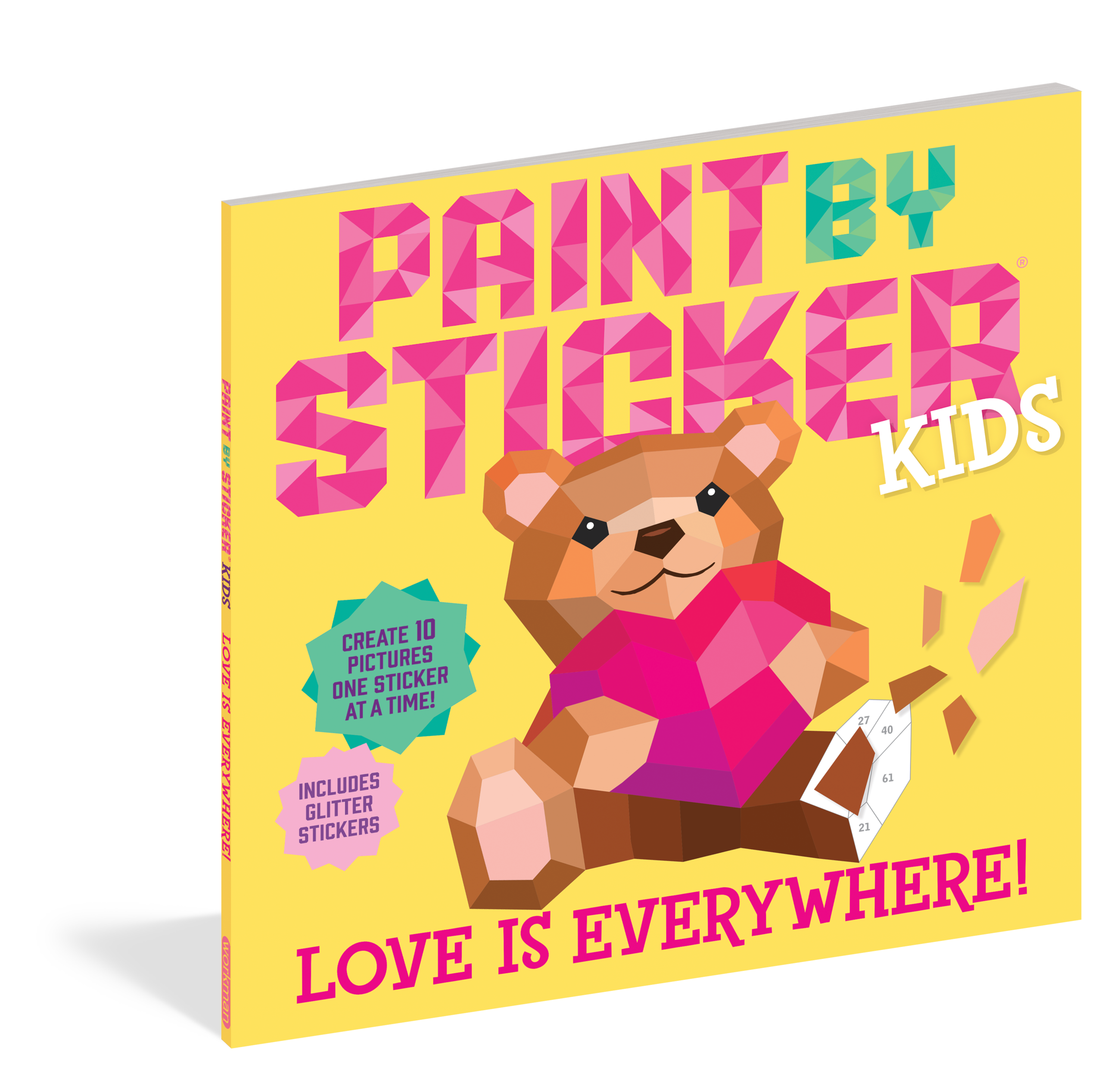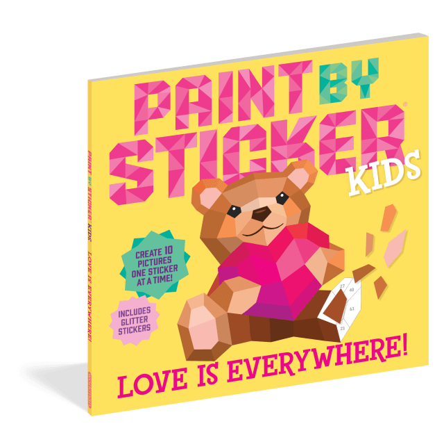 Paint by Sticker Kids: Love Is Everywhere! includes everything kids need to create ten colorful images, including a smiling glitter rainbow, a cute otter holding a heart-shaped shell, a kitten wearing glitter sunglasses, a pair of nuzzling bunnies, and more! All you need to do is follow three easy steps: