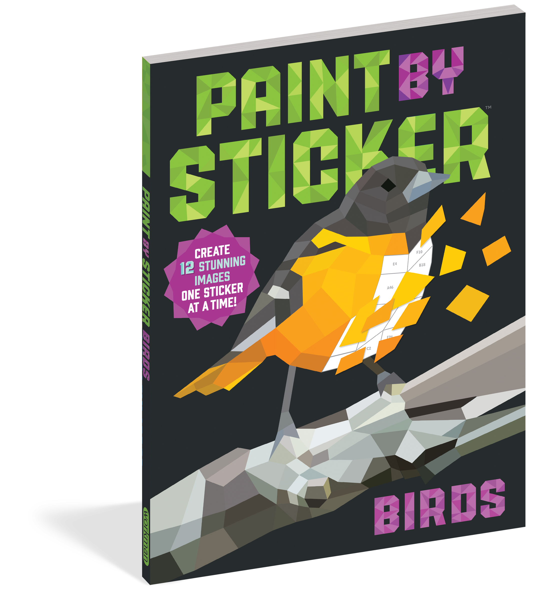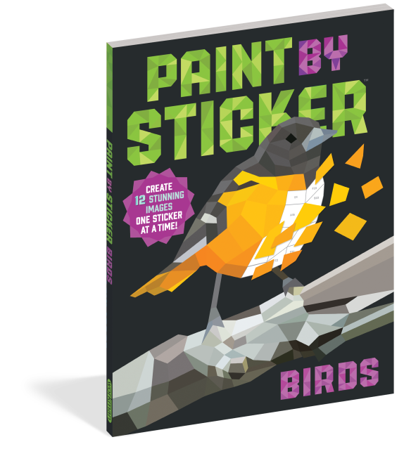 Paint by Sticker: Birds celebrates the rainbow of colors and shapes of the avian world: a red-headed woodpecker, a blue jay, an orange and black Baltimore oriole, an electric bright hummingbird.