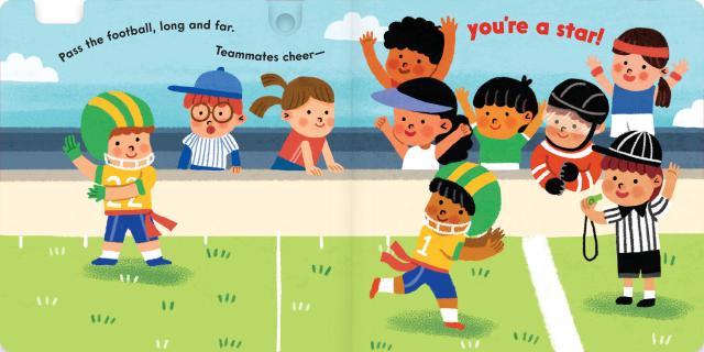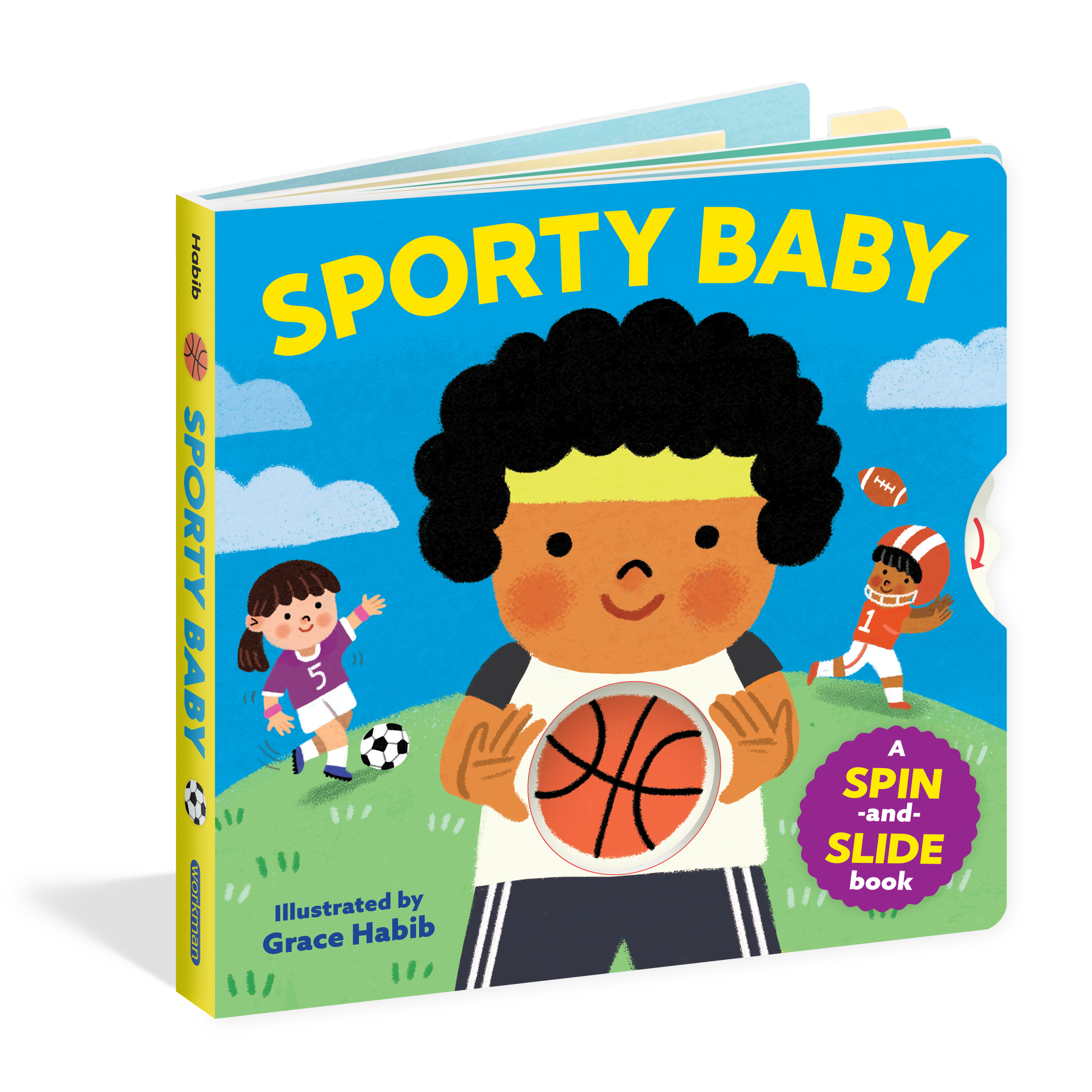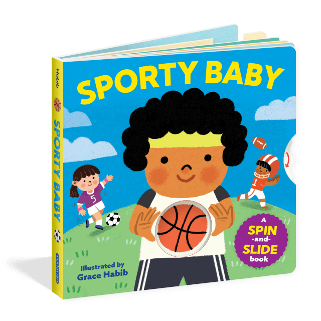 This action-packed board book celebrates favorite sports—from baseball and basketball to golf, hockey, and football. Little ones can spin the cover to see 8 sports balls. Inside, move sliders and spinners and pull and push tabs to make the balls move. Babies can bat the baseball, kick the soccer ball, putt the golf ball, slap the hockey puck, serve the tennis ball, bump the volley ball, shoot the basketball, and pass the football. With bright and colorful illustrations, sturdy moving parts, this book is a slam dunk for busy babies and sporty toddlers!